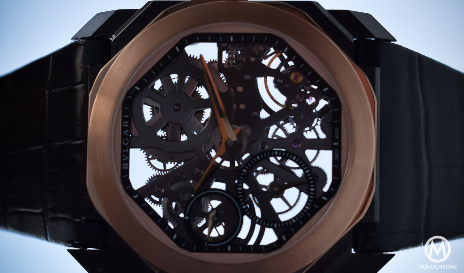 Presented in 2016, the Octo Finissimo Ultranero Skeleton is an evolution of the Finissimo small seconds sporting a steel case with DLC coating and an 18K pink gold bezel. The skeleton work is modern and edgy, exposing the understated yet complex architectural design of the caliber BLV128SK. In coherence with this contemporary look, the movement has been given a monochrome dark finish with black-coated bridges and mainplate with circular satin brush decoration.