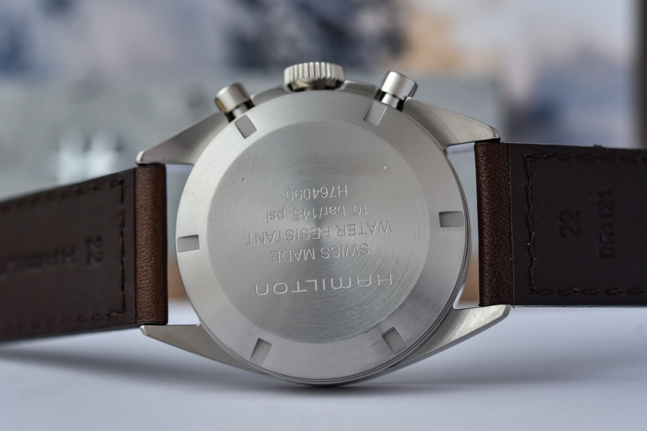 Quick Facts – 40mm x 14.35mm – stainless steel case – pump-pushers and push-pull crown – box-shaped sapphire crystal – solid steel caseback – 100m water-resistant – black grained dial – painted tracks and markers – white lacquered hands – Old Radium style Super-LumiNova – Calibre H-51-Si – hand-wound chronograph based on Valjoux 7753 – cam-lever operated – 27 jewels -28,800vph – silicon balance spring – 60h power reserve – hours, minutes, small seconds, chronograph – brown leather strap with steel pin buckle – EUR 1,995