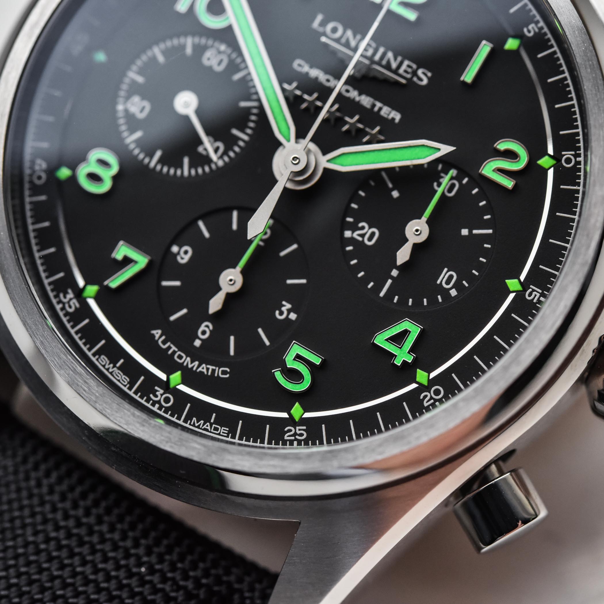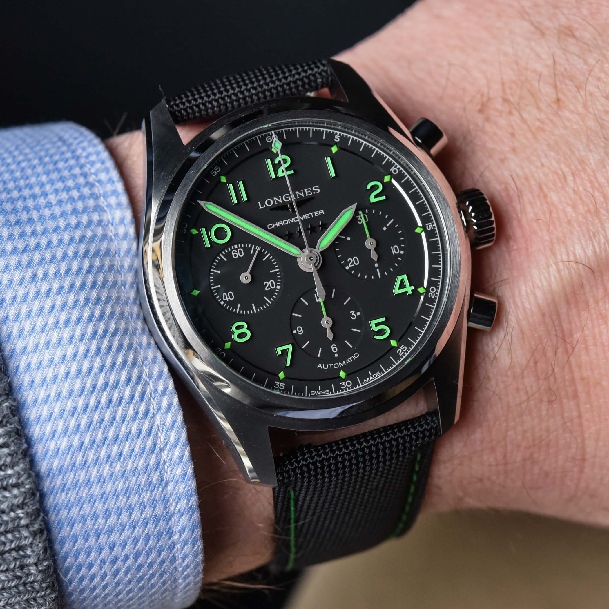 Quick Facts – 42mm x 16.50mm – grade 5 titanium case – sapphire crystal – solid titanium caseback – screw-down crown – 100m water-resistant – matte black dial – applied Arabic numerals – PVD-coated titanium hands – neon-green luminous material – Calibre L688.4 (ETA A08.L01) – COSC-certified automatic column-wheel chronograph – 27 jewels – 28,800vph – 66h power reserve – silicon hairspring – hours, minutes, small seconds, chronograph – black synthetic textile strap with neon green stitching – titanium pin buckle – EUR 3,740