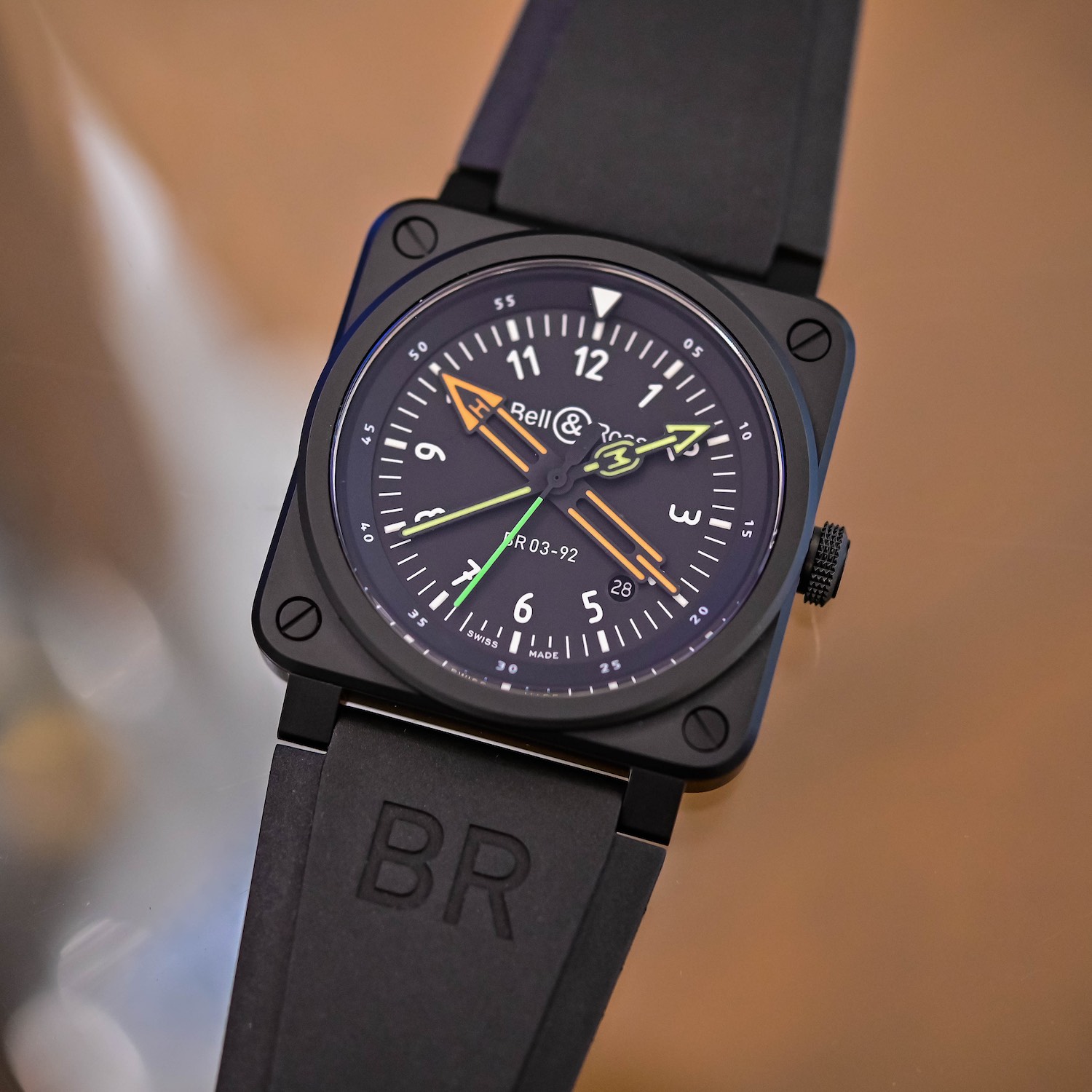 Quick Facts – 42mm x 42mm – matte black ceramic case – sapphire crystal – closed caseback – 100m water-resistant -matte black dial with radio compass layout – orange, yellow and green hour, minute and seconds hand – Super-LumiNova – BR-CAL.302 (Sellita SW300-1) – automatic – 25 jewels – 28,800vph – 38h power reserve – hours, minutes, seconds, date – black rubber strap with pin buckle – limited to 999 pieces – EUR 3,900