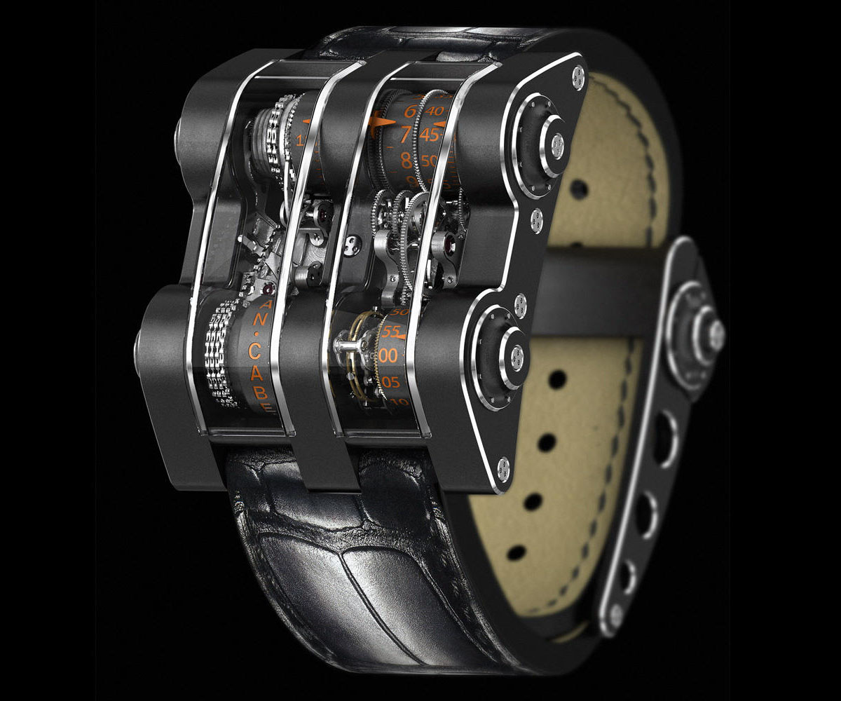 Among recent and futuristic developments, the Romain Jerome Spacecraft features a jumping cursor highlighting hours on a lateral hour indication. Every creation by MB&F opens up new avenues to explore, away from conventional watchmaking. The HM5 uses a lateral display to show both the hours and minutes. The mechanics to display time are yet different from the Romain Jérôme Spacecraft and are based on a jumping hour indication, reflected 90° to the vertical and magnified 20%.