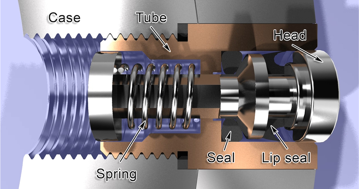 Above: Helium relief valve of the Hamilton Khaki Frogman 1000m titanium presented at Baselworld 2016, closed (blue) or opened (red).