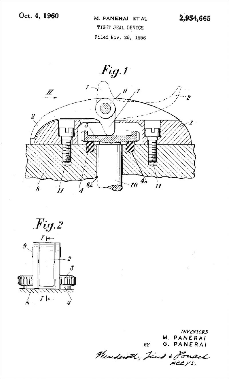 Drawings from the 1950s for the patented Panerai crown protecting bridge, a signature feature for the Italian brand and its now iconic Luminor line. The watch name is connected to a self-luminous substance based on tritium, Luminor, that later superseded radium, in order to give high visibility to the dials of the brand’s instruments.