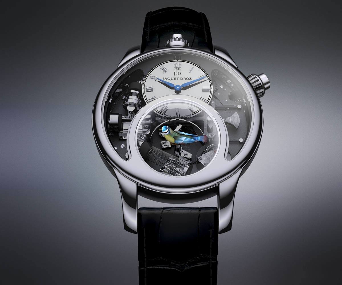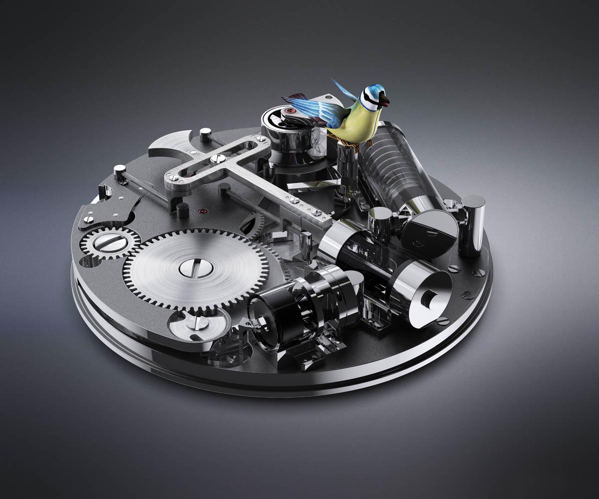 Perpetuating the spirit of its founder, the great clock and automaton maker Pierre Jaquet-Droz, the eponymous manufacturer released the superb ‘Charming Bird’. This masterpiece is the first to integrate a singing bird automata technology into a wristwatch, with piston-driven bellows to provide the whistle while the bird turns and flap its wings. The techniques inherited from the 18th century have been modernized and miniaturized. For instance, sapphire is used for the tube and carbon for the piston when centuries ago Pierre Jaquet Droz was using animal bladder for similar purposes. Although the automaton is not triggered by the watch mechanism, this creation is remarkable enough to be mentioned here.