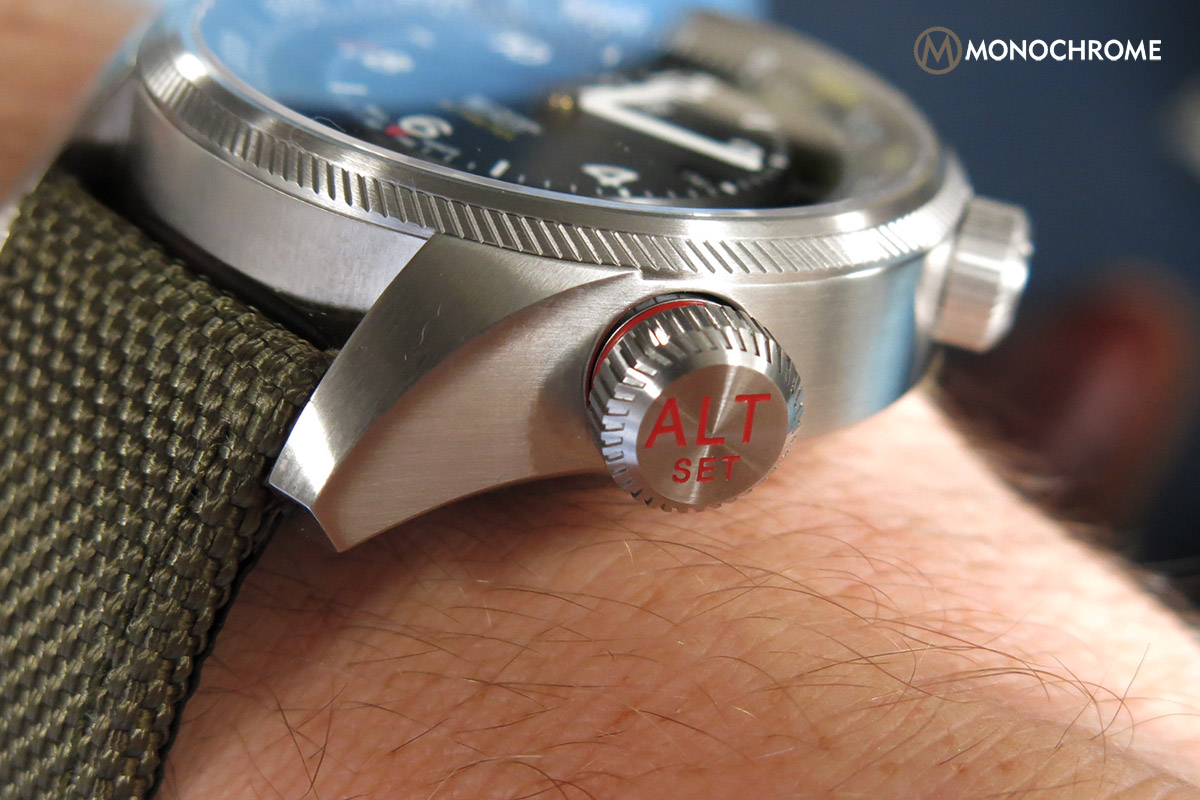 We already described it in the first article we wrote, but hands-on experience put that bit of information to the test. You unscrew out the crown at 4 o’clock and this allows for air to enter the case. The aneroid capsule measures the pressure you are at, and you can then set the yellow marker to the correct height by pulling out the crown. Once set, you will see the yellow marker travel around the dial move up or down as you climb or descent, indicating the altitude on the chapter ring surrounding it. The red marker, also surrounding the dial, indicates the air pressure on the lower part. Pay attention though, as the watch is no longer watertight when the crown is unscrewed.