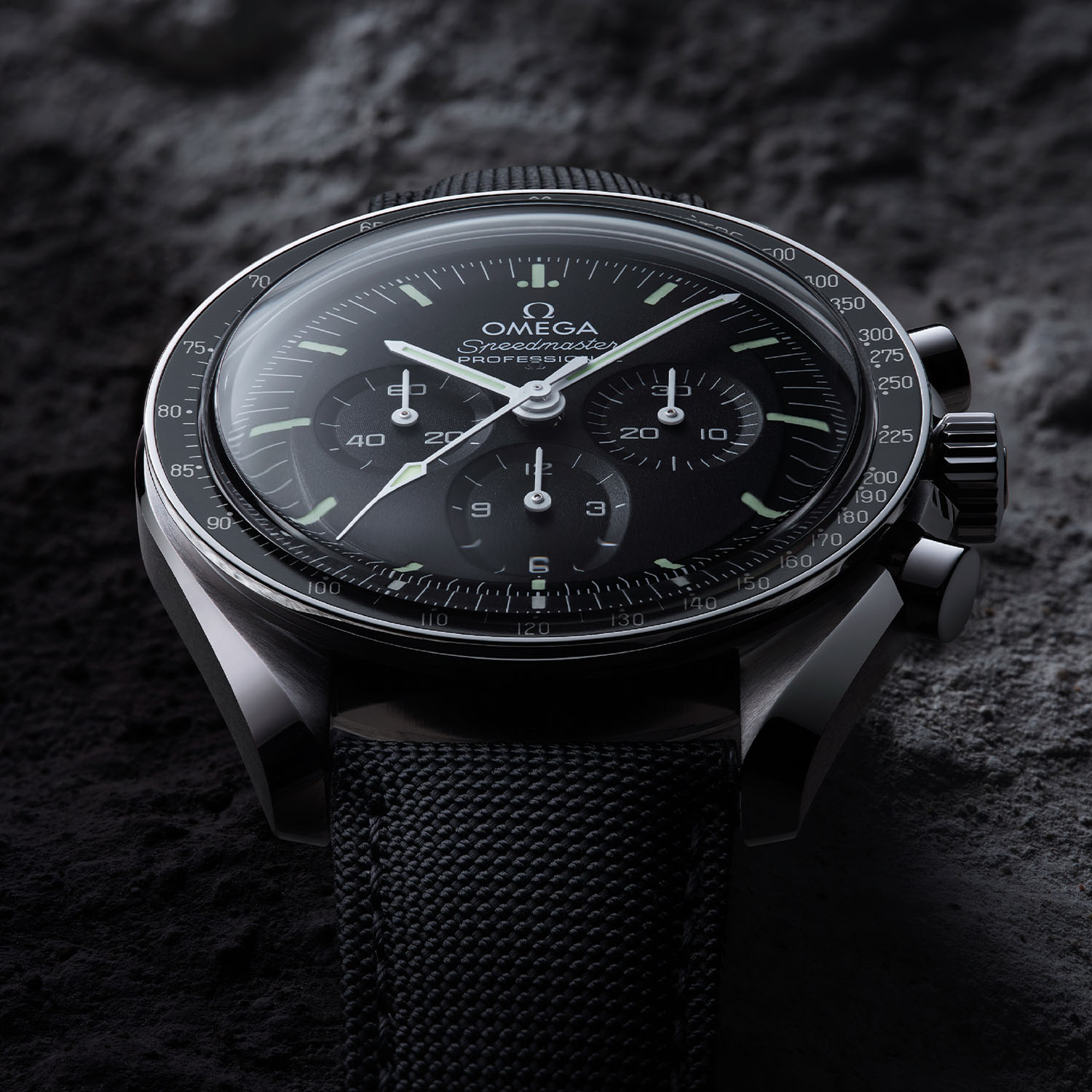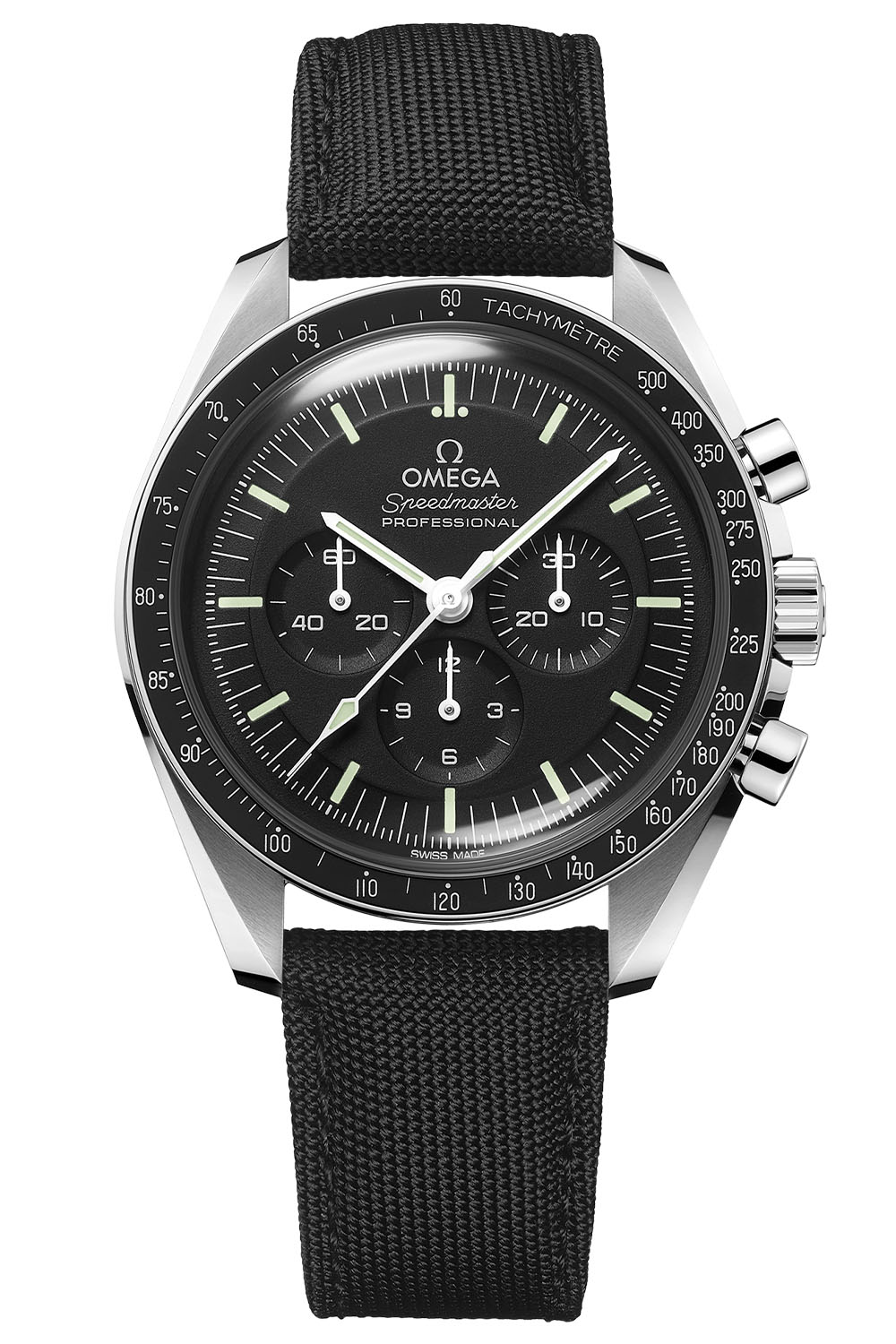 Also, just like previous iterations, the Speedmaster Moonwatch Professional Master Chronometer can be ordered on a strap too. The Hesalite model comes on a black fabric strap while the sapphire sandwich watch is delivered on a smooth calfskin strap.