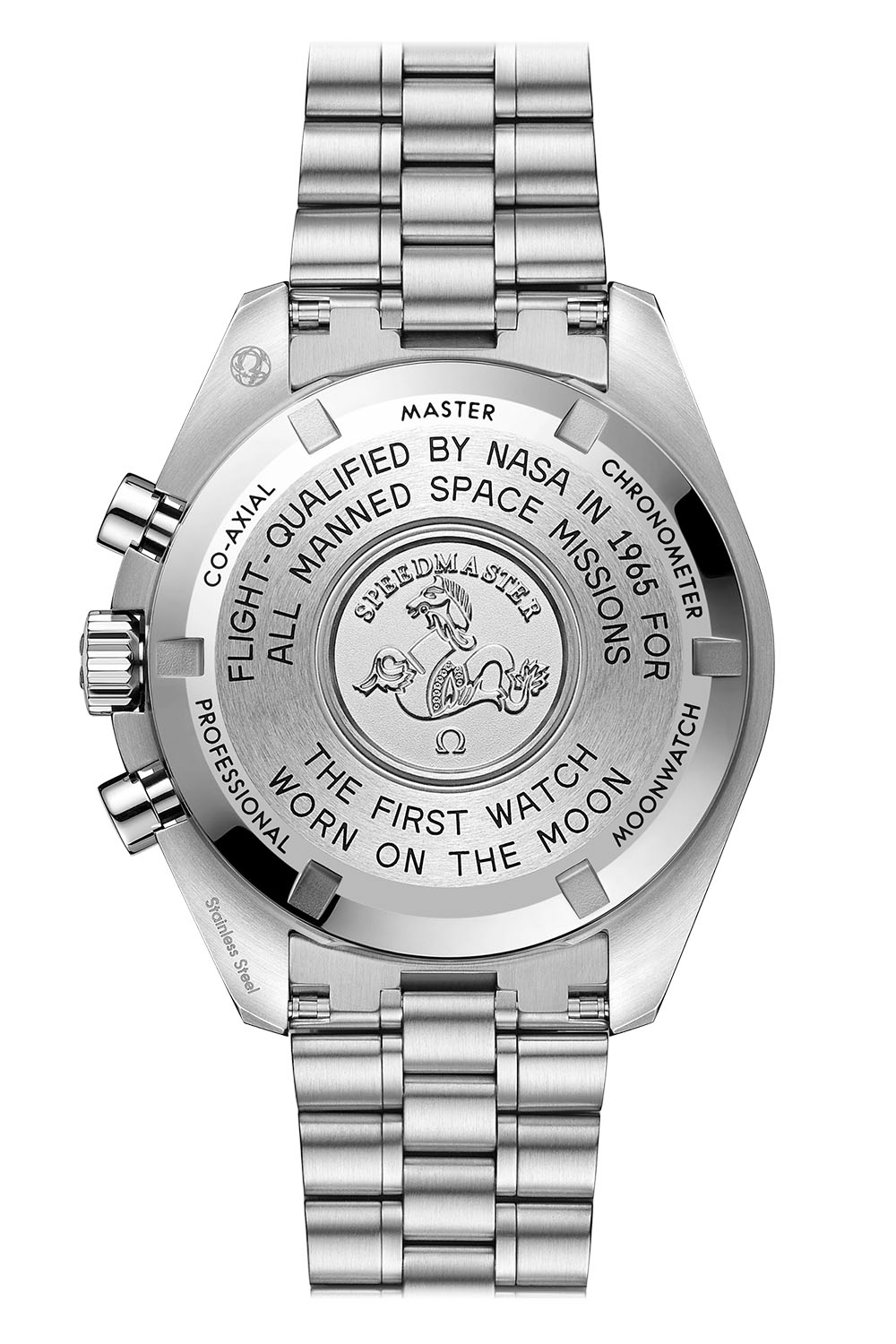 First of all, importantly, the case retains the same style with its lyre-type lugs, its 42mm diameter, its combination of brushed surfaces and polished accents and a 50m water-resistance. As before, the stainless steel model is available in two versions, one with a classic Hesalite crystal and a solid steel back – new for this reference, the caseback is double-stepped. The other steel model has a so-called sapphire sandwich with sapphire crystals front and caseback. However, if the mention “The First Watch Worn on the Moon” is still present, the other one has been updated, now being “Flight Qualified by NASA in 1965 for All Manned Space Missions”.