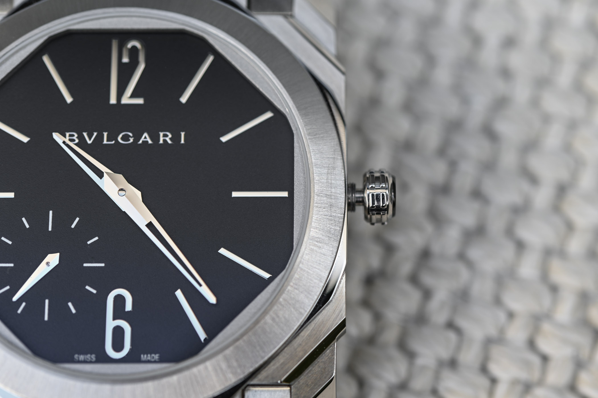 As you know, we love the Octo Finissimo at MONOCHROME. It’s bold, modern, refined, complex in shape and it features a fascinating ultra-thin movement – Calibre BVL138 with micro-rotor – just 2.23mm thick, making it a contender for the thinnest time-only watch on the market today. For the LVMH Watch Week, Bvlgari brings a new version of its highly acclaimed watch in steel… Well, you could argue that this watch already existed. True, but the new version gets rid of the sandblasted finish (not liked by all) for a more classic and more contrasting combination of satin and polished surfaces – and it gives the watch an even more architectural look. Best of all, the water-resistance goes up from 30m to a very respectable 100m, thanks to a screw-down crown and only 0.1mm extra thickness (5.25mm now versus 5.15mm)… Insignificant.