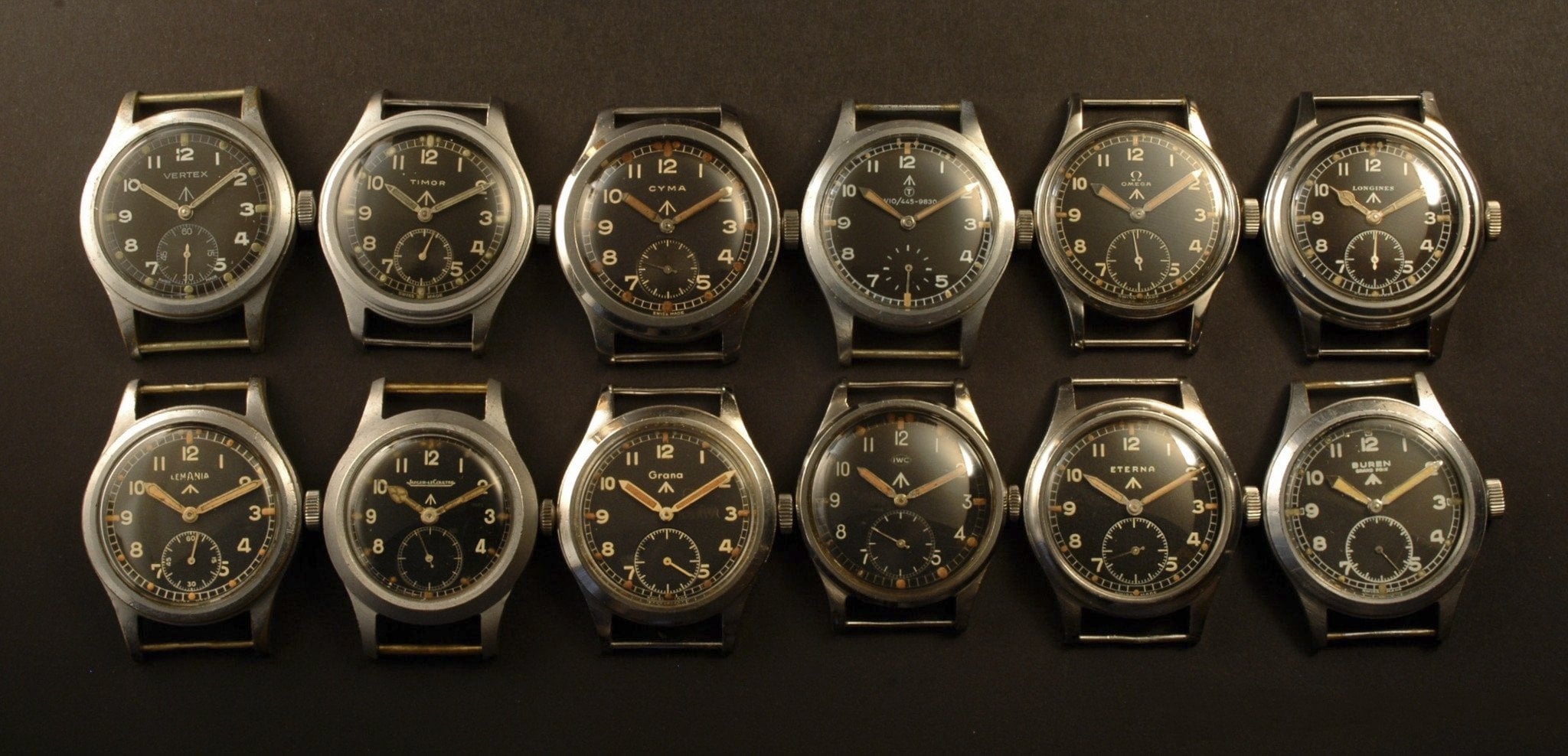 Near the end of World War II, the British Ministry of Defence commissioned field watches from 12 Swiss brands for special field units (including engineers, artillery and so on). They’re arguably the most famous of all historic field watches and easily identifiable by specific design elements. These Dirty Dozen models had black dials, Arabic numerals, small seconds at 6 o’clock, luminous hands and markers, railroad minute tracks and the Broad Arrow and W.W.W. (Watch, Wrist(let), Waterproof) engraved on the case back, and dials featured the arrow at 12 o’clock as well (symbolising property of the British Crown). Other requirements included a shatterproof acrylic crystal, 15-jewel movement (regulated to chronometer standards), 36.5mm case and water/shock resistance. British watch companies were already monopolised by the war effort (producing weapons and ammunition), so Swiss companies were used for the initiative. Although not identical, the 12 Swiss brands produced very similar models within the specific design requirements, and finding a complete, unadulterated set today is a collector’s dream. The 12 Swiss brands were Buren, Cyma, Eterna, Grana, Jaeger-LeCoultre, Lemania, Longines, IWC, Omega, Record, Timor and Vertex, with the latter being a British brand that produced the watches via Swiss facilities – it was a Swiss-made watch from the only British watchmaker on the list. Also of note – these weren’t referred to as the Dirty Dozen at the time, and likely picked up the nickname over two decades later from the 1967 movie, The Dirty Dozen.