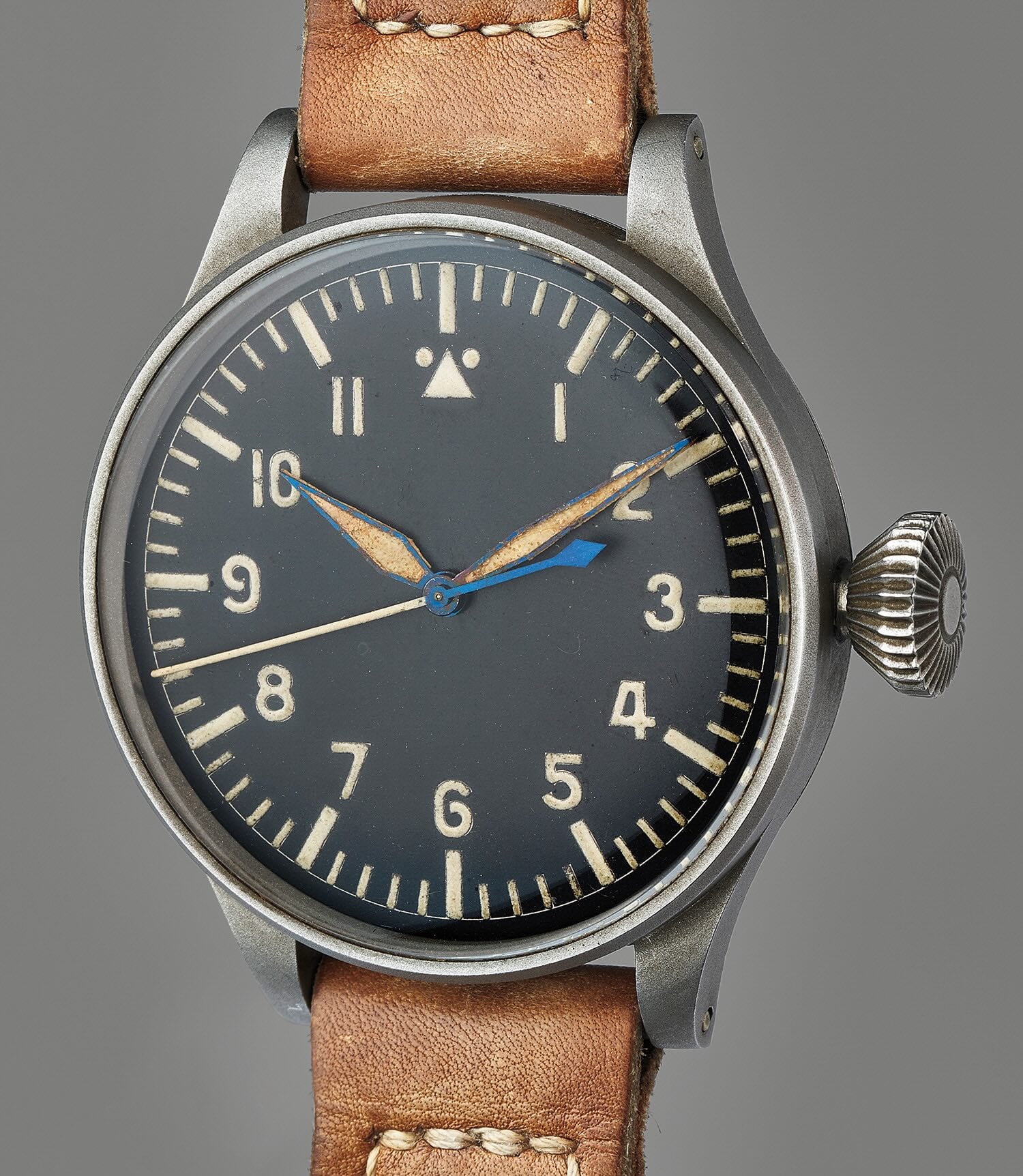 The B-Uhr (Beobachtungsuhr or German for observation watch) was born in 1940 for Luftwaffe aviators and remains a classic style today. Cases were large at 55mm in diameter and featured oversized onion crowns (or other large types) and a soft iron cage for high magnetic resistance. During the war, there were five brands commissioned to make these watches (similar to the Dirty Dozen initiative) – Laco, A. Lange & Söhne, Stowa, IWC and Wempe. Two distinctive matte black dial types define the B-Uhr. Type A dials (Baumuster A) debuted in 1940 with a simple, almost sterile design with large Arabic numerals for 12-hour time and a triangular index with two dots at 12 o’clock. A year later, Type B dials (Baumuster B) had large Arabic numerals for minutes instead of hours – 5 to 55 with a triangular arrow marking 12 o’clock. Inside of this were smaller numerals for 12-hour time. Unlike wartime field watches that had prominent 12-hour time with 24-hour time circling inside, Type B dials never included 24-hour time. Both B-Uhr types had leather straps riveted to fixed bars for strength, and the large cases were often worn over flight jackets (like a dive watch over a wetsuit).