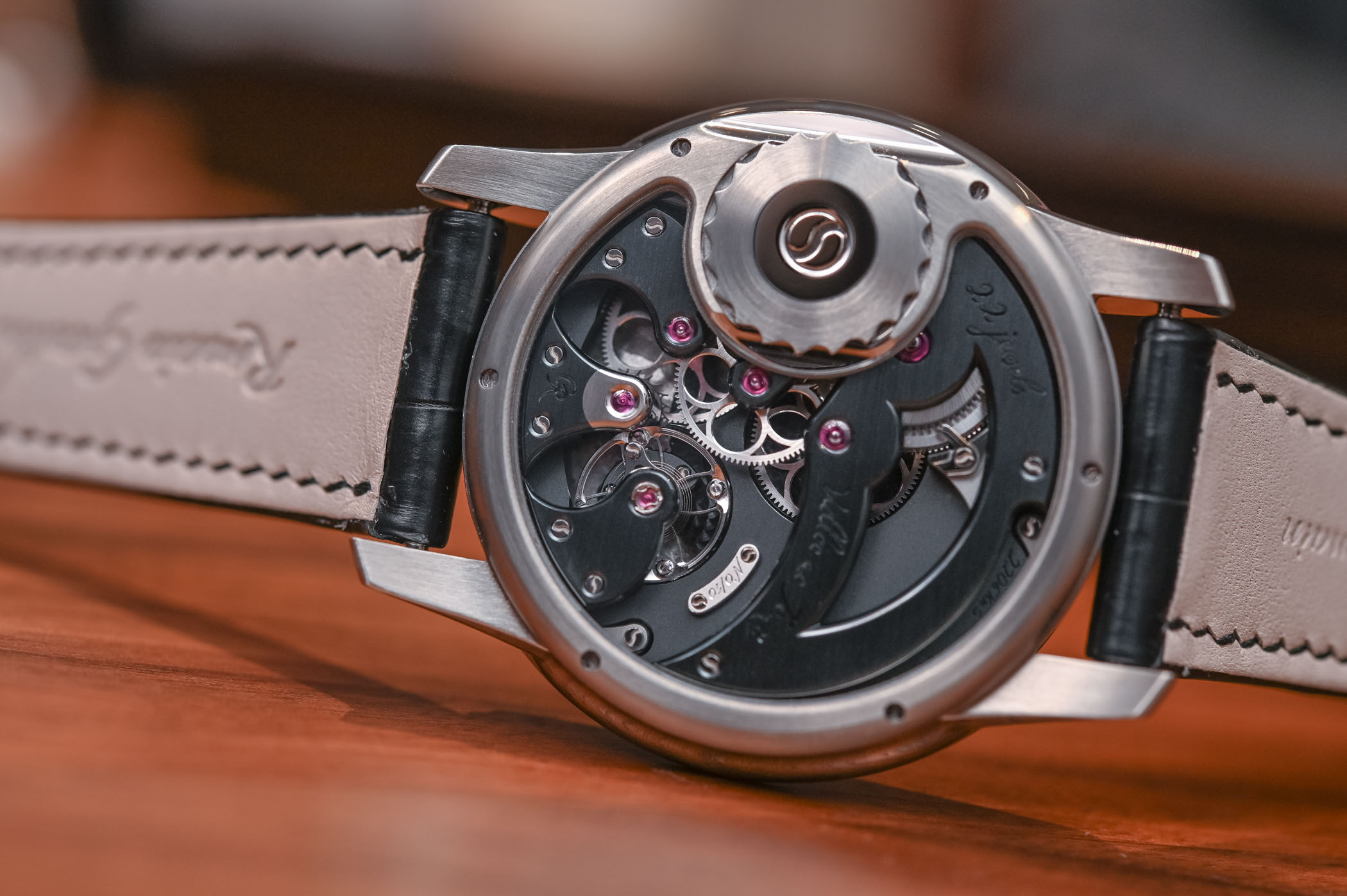 The snail cam is a recurring element in previous Romain Gauthier movements. For the Continuum the snail cam halts the balance wheel, only to kickstart it with a little impulse due to the widening profile, making a rotation when the crown is pushed back in. Using 154 components, the movement runs at a frequency of 28,800vph and provides 60 hours of power reserve when fully wound.