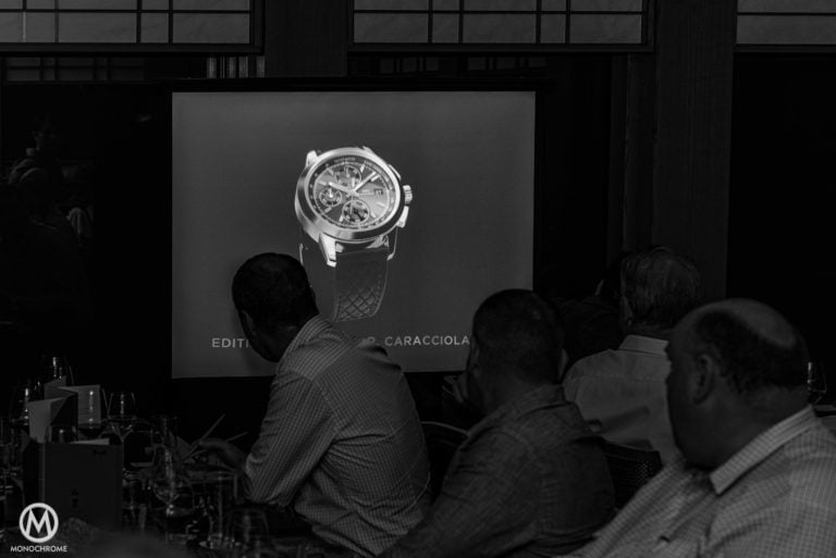 - Black dial with Arabic numerals, sub seconds at 6 o’clock and railroad style minutes