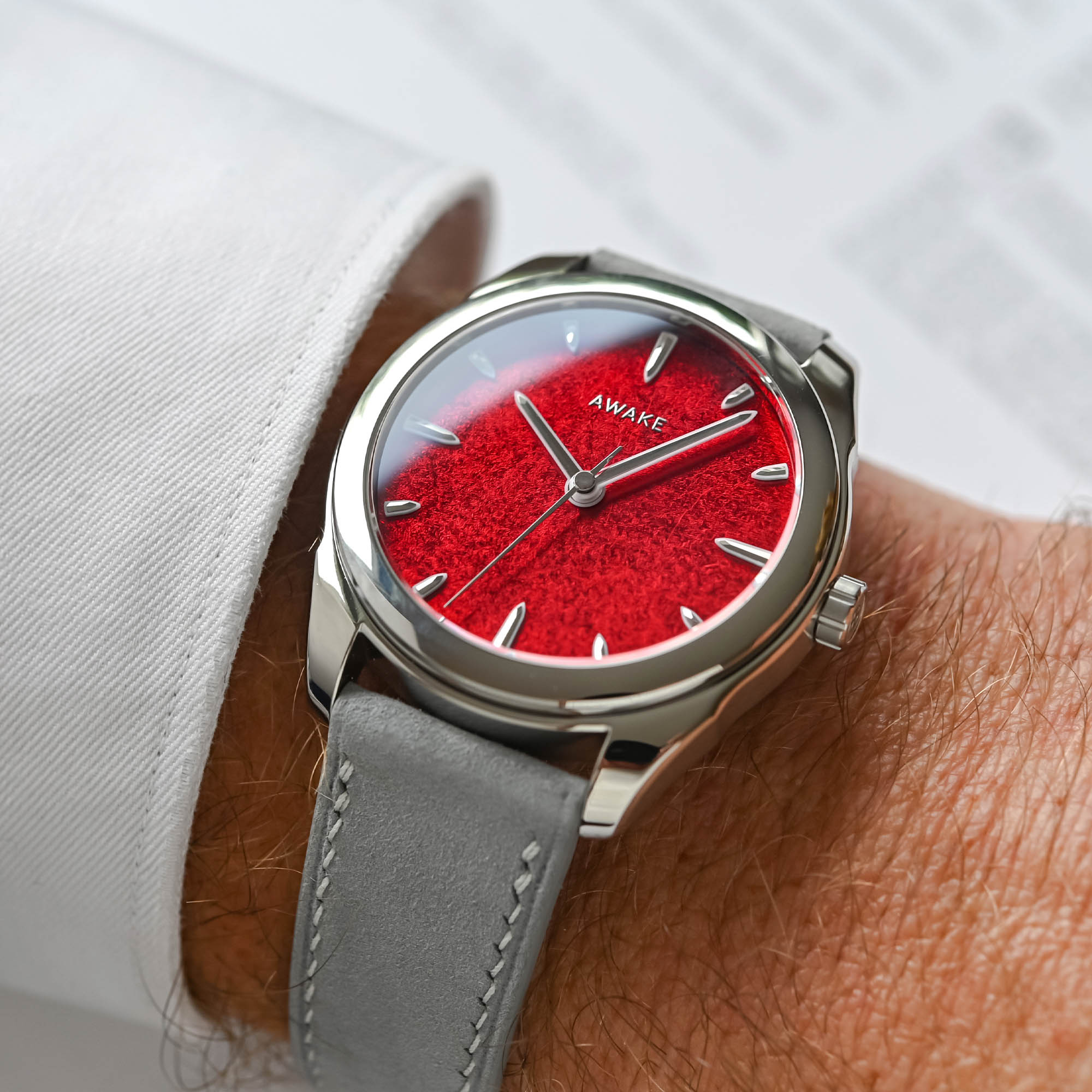 The screw-in caseback has a textured Clous de Paris ring surrounding the sapphire crystal, which offers a view of the La Joux-Perret G101 automatic three-hand movement assembled in La Chaux-de-Fonds. Delivering a robust 68-hour power reserve, the customised rotor is decorated with a bead-blasted centre and inscribed with ‘La Joux-Perret Pour Awake’ in polished relief.