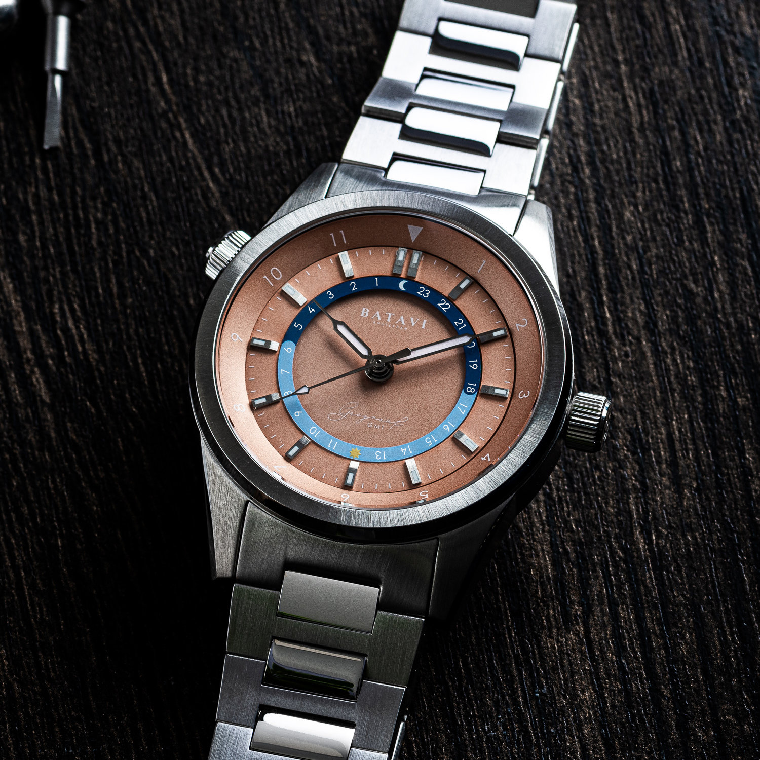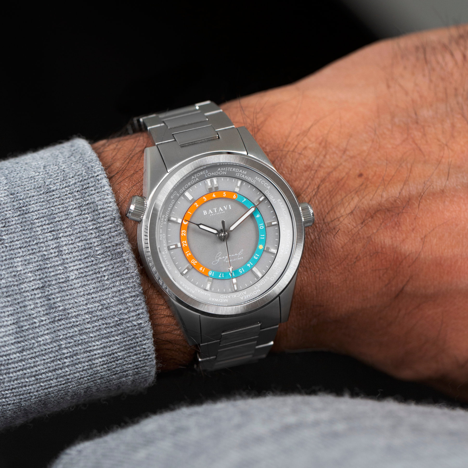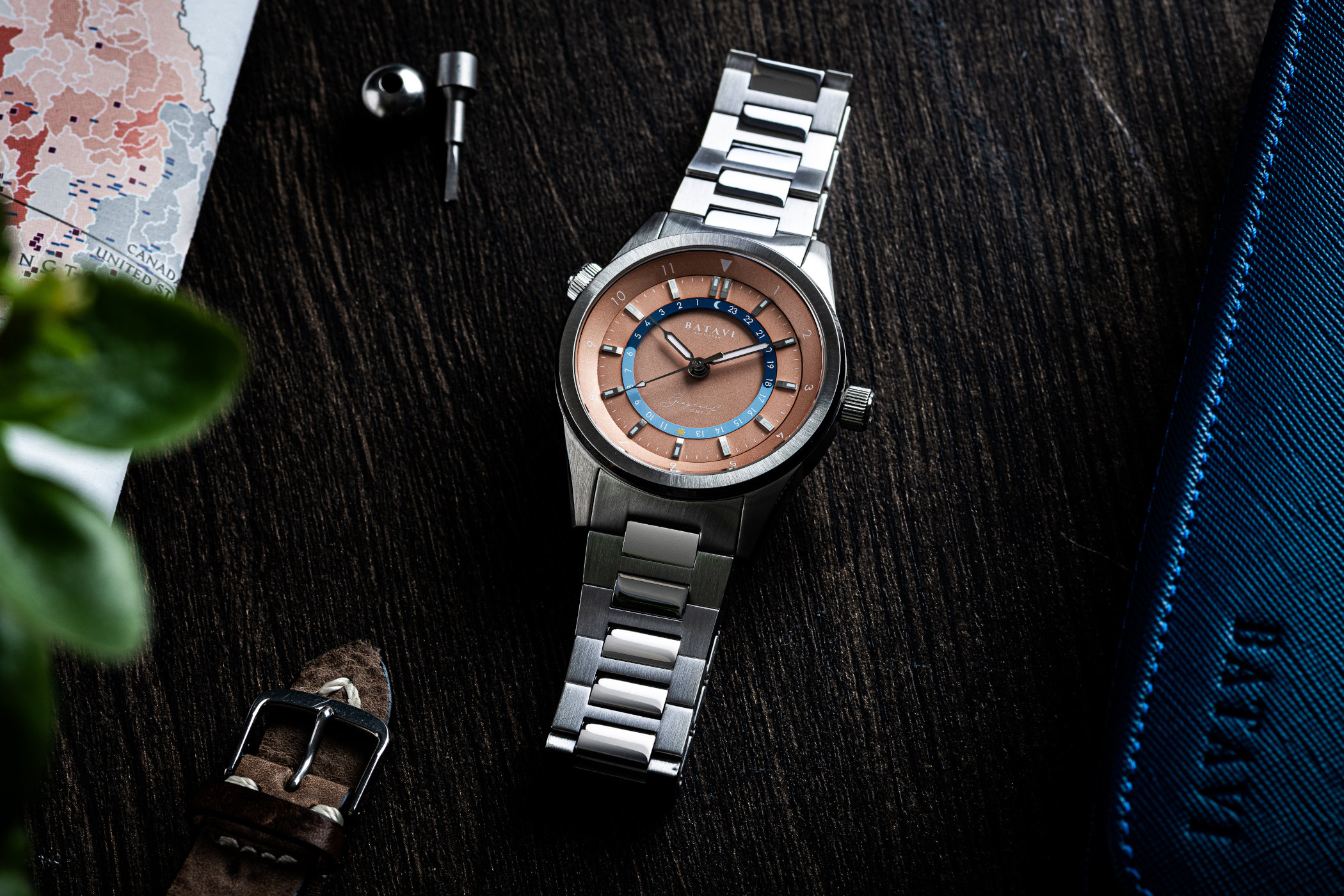 The new Batavi Geograaf GMT and Worldtimer will come on a stainless steel H-link bracelet with polished centre links, a folding clasp and quick-release push pins. Batavi supplies it with a two-watch travel case in blue. The price is not yet determined but expected to be between EUR 599 and EUR 649 as Super Earlybird during the Kickstart Launch, in early May 2022.