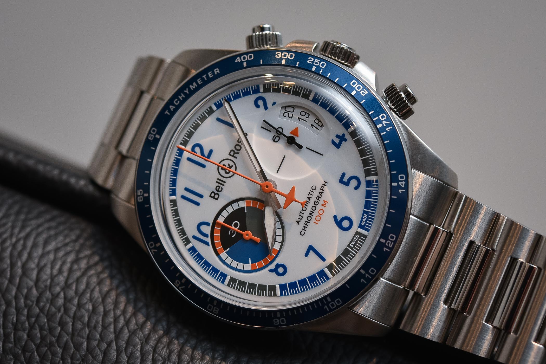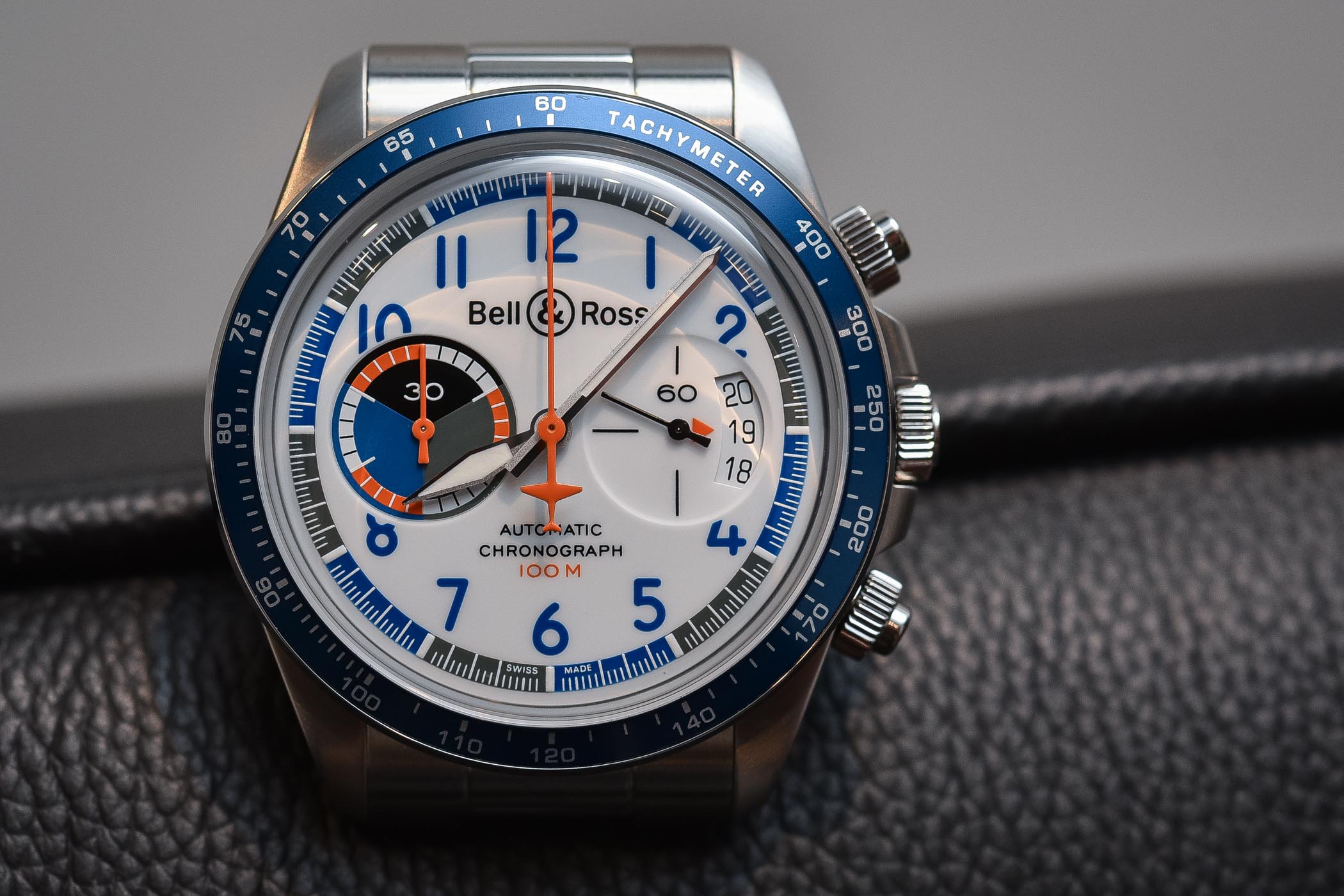One of the watches to accompany this aeroplane racer is the BRV2-94 Racing Bird, a pilot’s watch with chronograph functionality and a distinctly retro colour theme. It uses the same base as last year’s model, meaning a 41mm steel case with screwed pushers and crown, and is offered on either a blue and orange leather strap or a three-link satin-finished steel bracelet. Personally, I prefer the steel bracelet version, as there’s already a lot of colour going on with this watch and the addition of a blue strap is a bit overpowering.