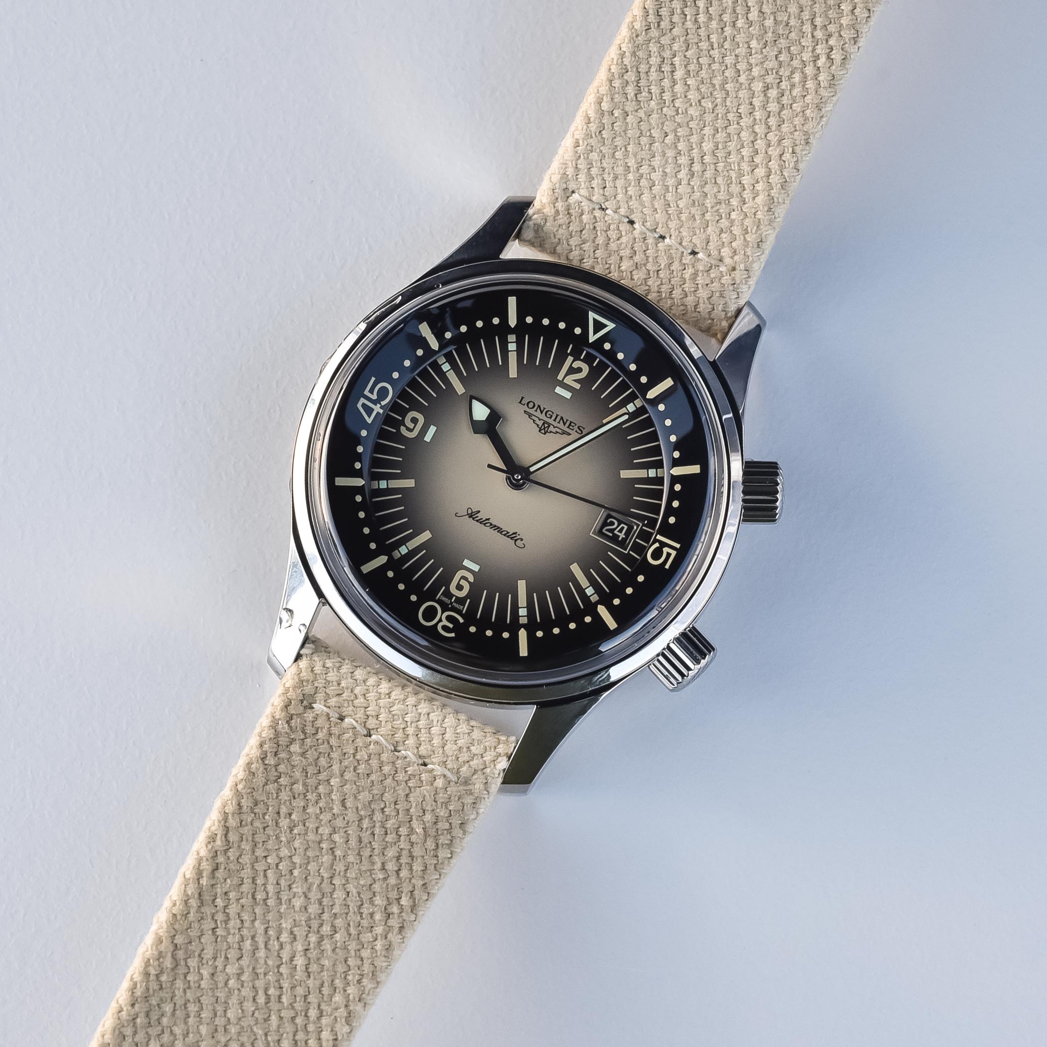 Quick Facts – 42mm x 12.7mm – stainless steel case, polished – screw-in crowns and screw-down caseback – sapphire crystal – 300m water-resistant – internal rotating diving bezel – sand beige gradient dial with beige printed markers and tracks – signature hour and minute hands with Super-LumiNova elements – Calibre L888.5, automatic – 72h power reserve – 25,200vph – beige coloured textile strap with steel pin buckle – EUR 2,240