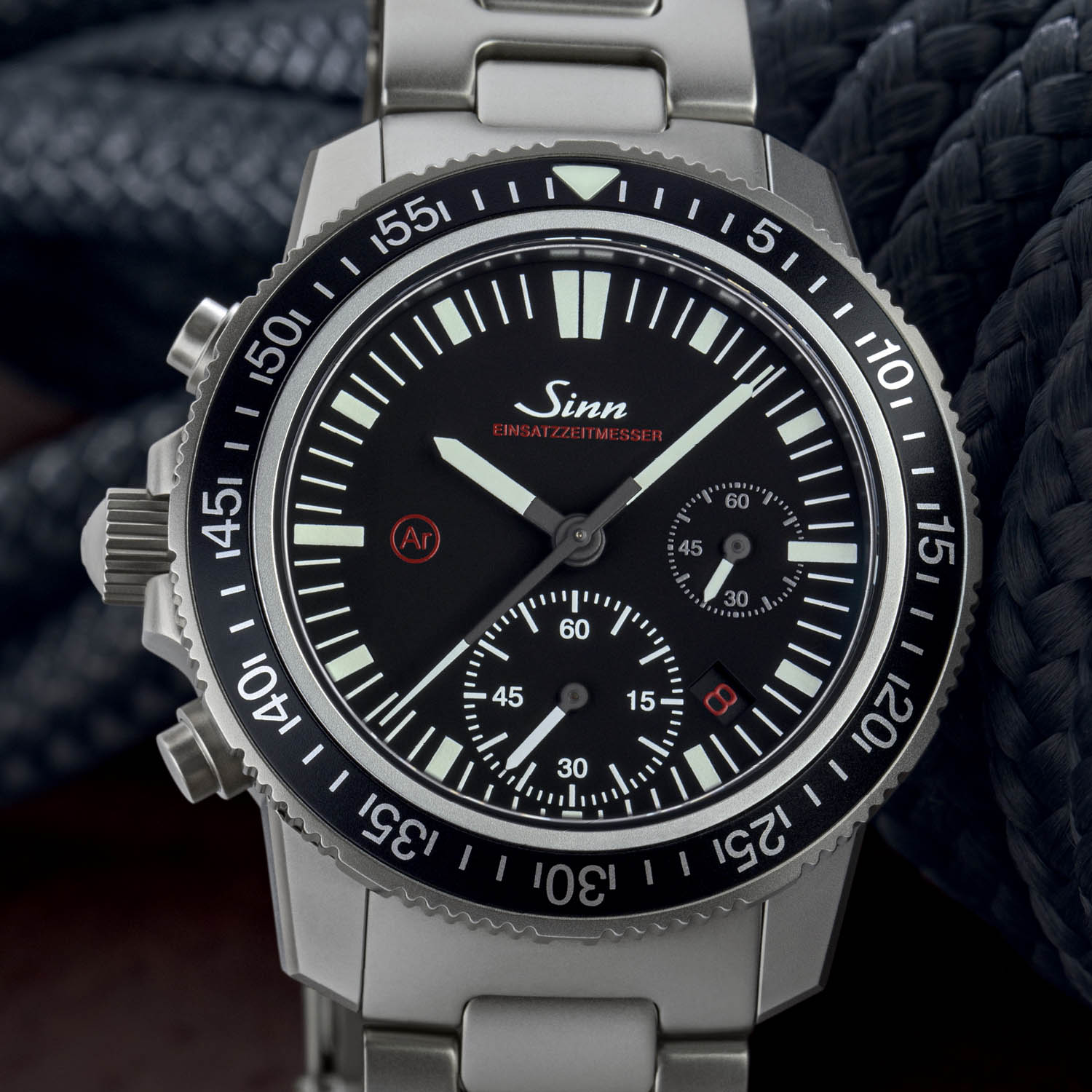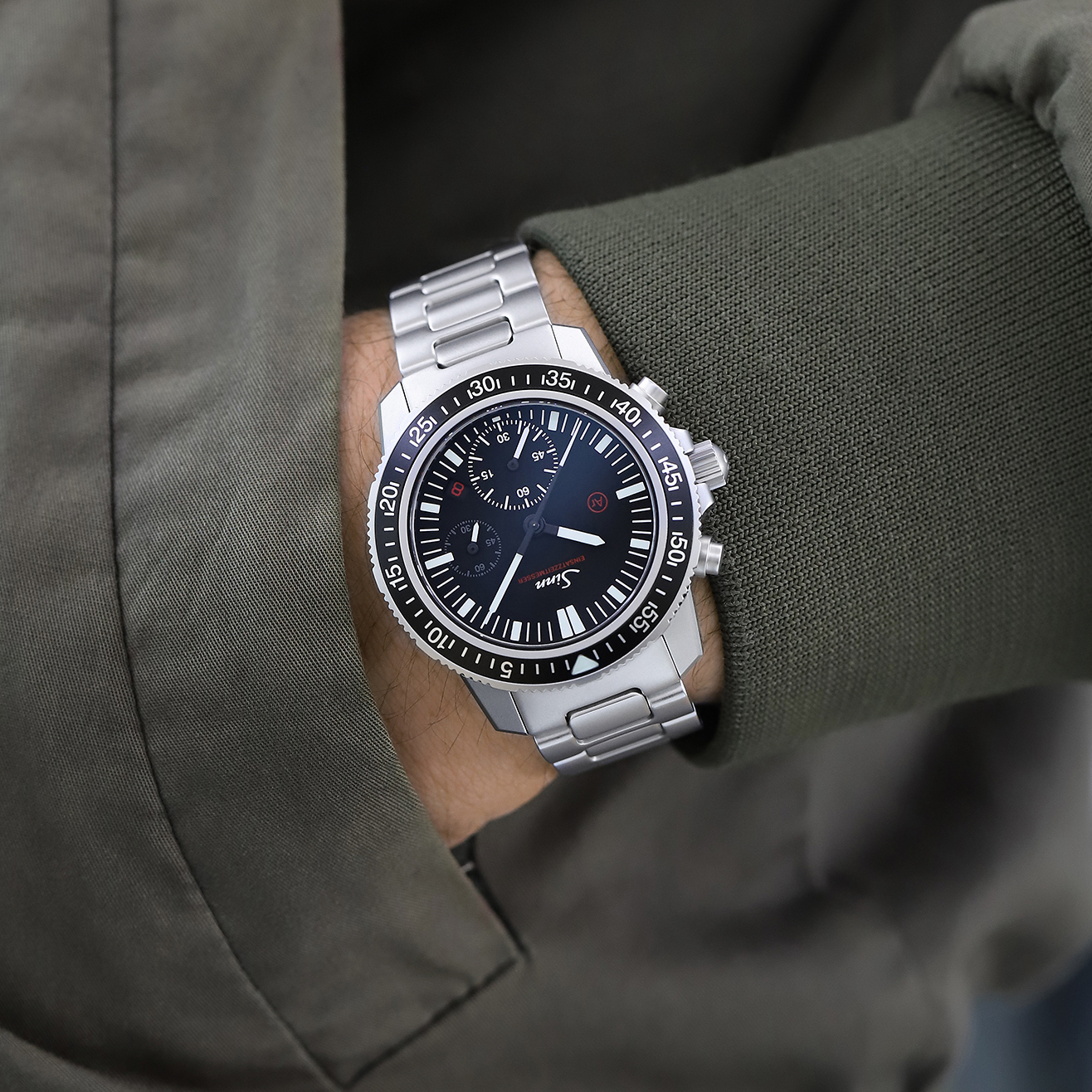 Quick Facts – 41mm x 15mm – stainless steel case, matte bead-blasted – rotating diving bezel with black aluminium insert – sapphire crystal on both sides – left-sided screw-down crown and pushers – 500m water-resistant – matte black dial with mission-timer design – painted markers and hands with Super-LumiNova – SINN SZ02 movement (modified Valjoux 7750 base) – automatic chronograph – 26 jewels – 28,800vph – 45h power reserve – bead-blasted steel bracelet, black rubber strap or black leather strap – DIN 8310/DIN 8306/ EN250 / EN14143 compliant – EUR 2,650 on strap or EUR 2,850 on bracelet