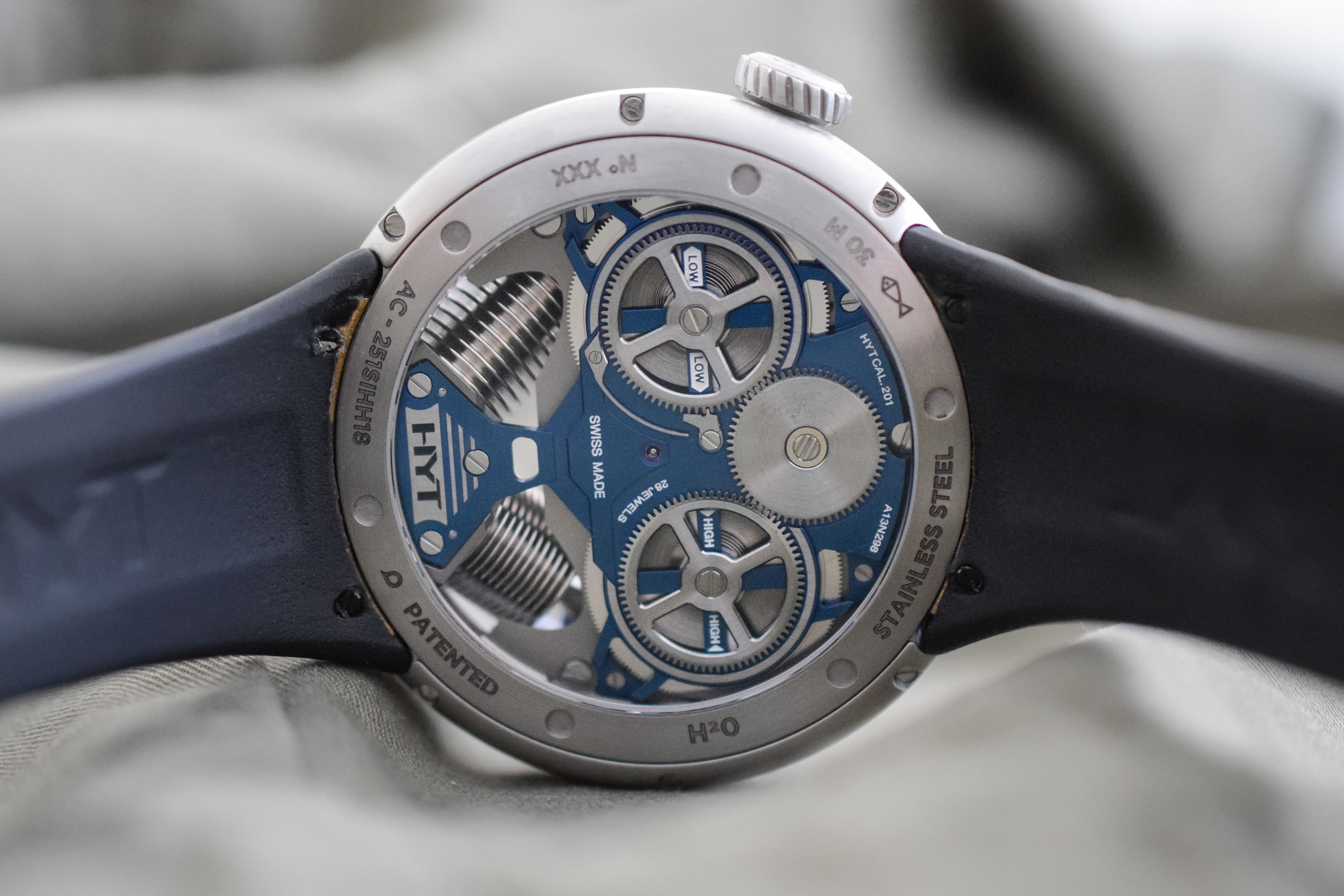 Quick facts: 51mm x 19.95mm steel case – water-resistant to 30m – hand-wound calibre with fluidic hour indication and jumping minutes – rubber strap with folding buckle – CHF 95,000 – for more information, visit www.hytwatches.com.