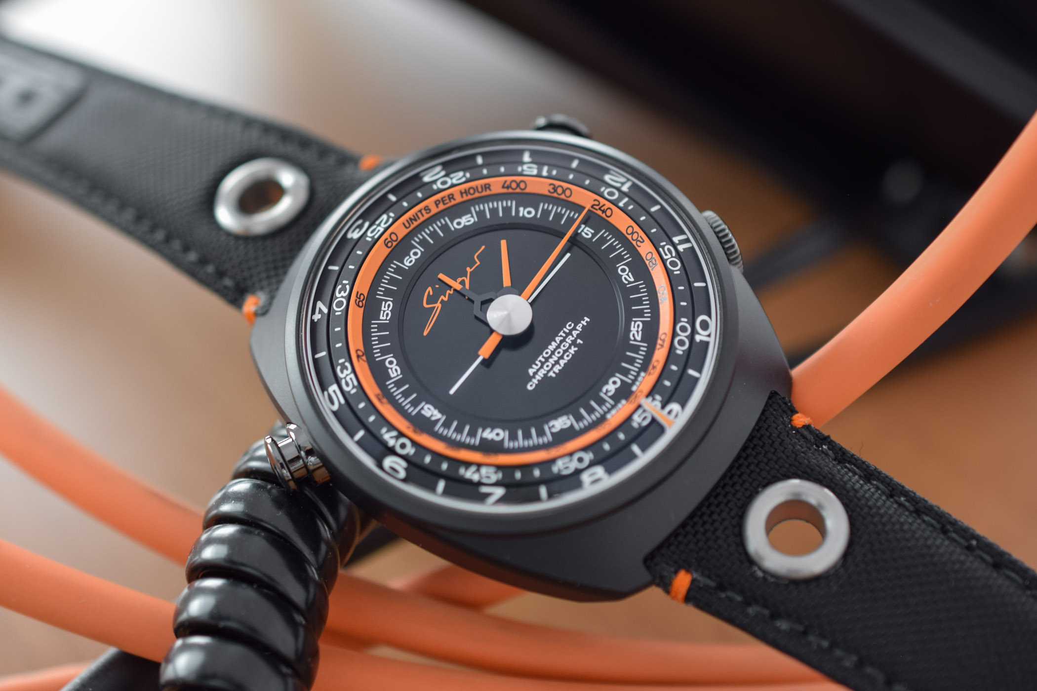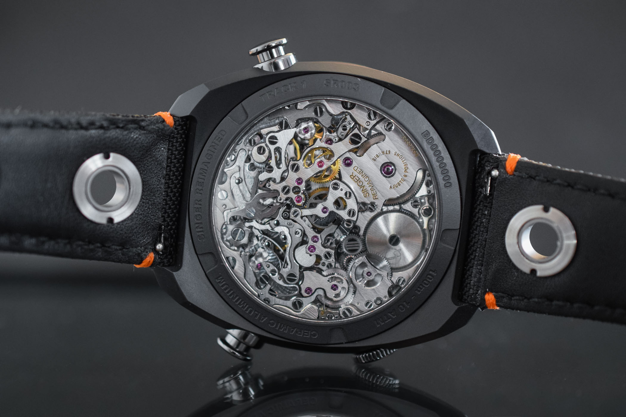 The Track 1 Hong-Kong edition is a sportier, more aggressive take on the Singer Reimagined revolutionary centre chronograph, one of the most sensational developments of the past years. The deep black case is fashioned out of ultra-resistant, ultra-light ceramic aluminium. The hours, minutes and seconds of the chronograph are coaxially displayed in the centre of the watch, allowing the elapsed time to be read at a glance. The time is indicated on the two peripheral rotating discs thanks to a small pointer at 6 o’clock. Turning the watch over, the exhibition caseback offers a breathtaking view of the intricate chronograph mechanism.