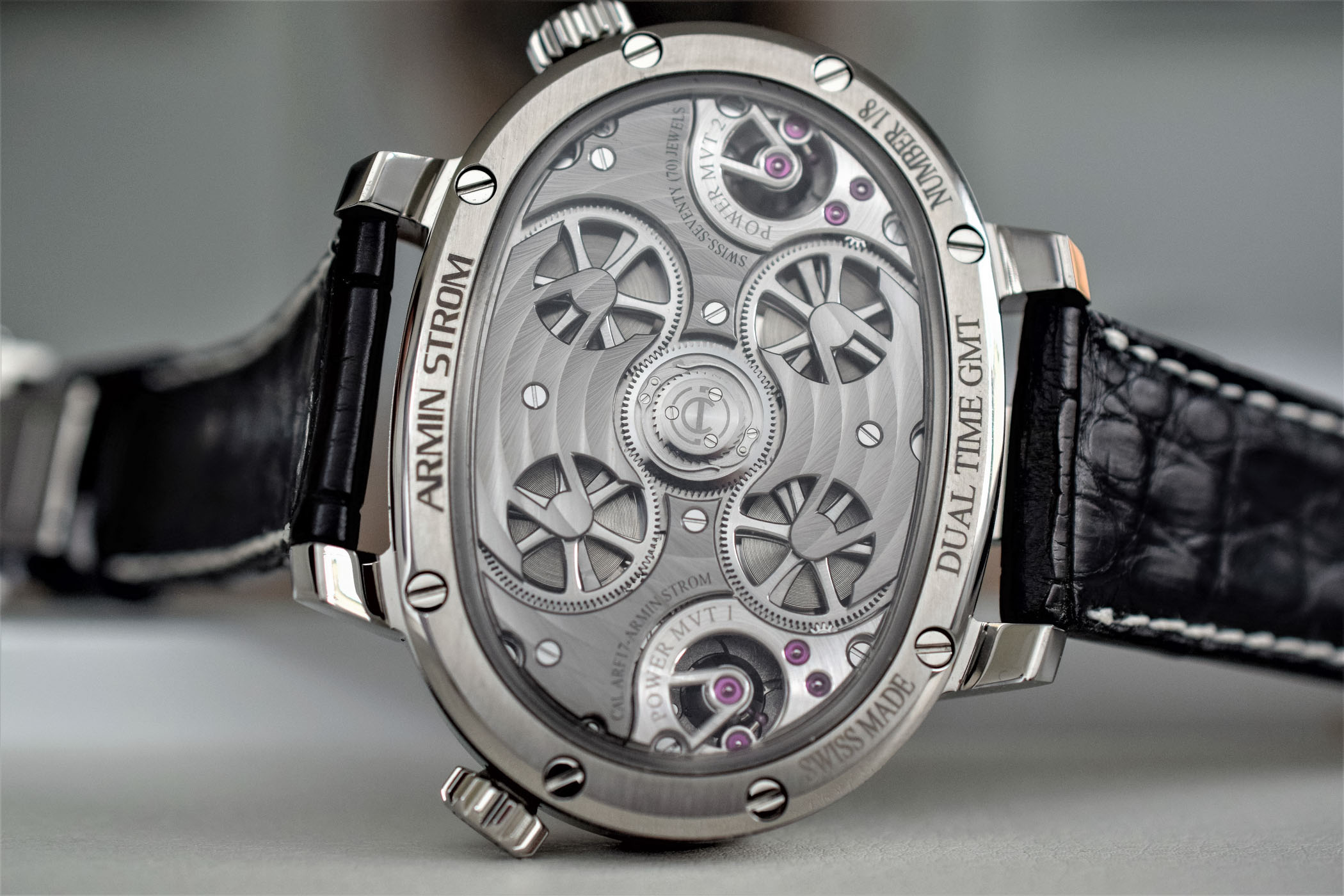Quick facts: 59mm x 43.4mm (including lugs) x 13mm titanium case – water-resistant to 30m – hand-wound dual time movements with twin hours and minutes, 24h day/night and power reserve indications – alligator strap with pin buckle – CHF 180,000 – limited edition of 8 pieces – for more information, visit www.arminstrom.com.