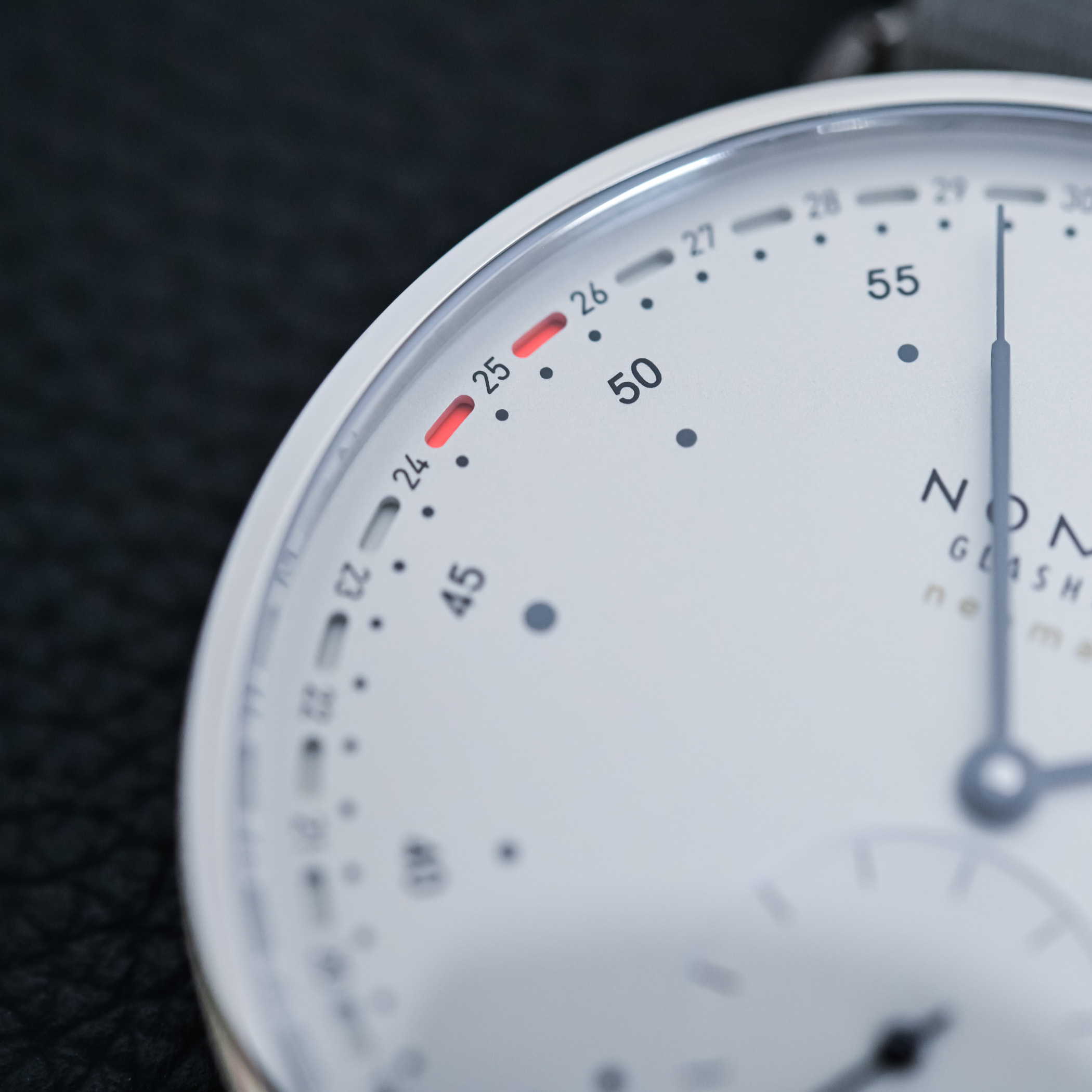 Quick Facts – 40.5mm x 9.1mm – stainless steel case, polished – wire lugs – domed sapphire crystal – sapphire crystal caseback – 50m water-resistance – white silver-plated dial – oxidized black hands – date indicated by cutouts and neon orange markers – DUW 6101 Calibre, in-house – automatic winding – 21,600vph – 42h power reserve – transversal balance bridge – NOMOS Swing-System with blue hairspring – quick-set date system (two ways) – dark grey textile strap – USD 4,660