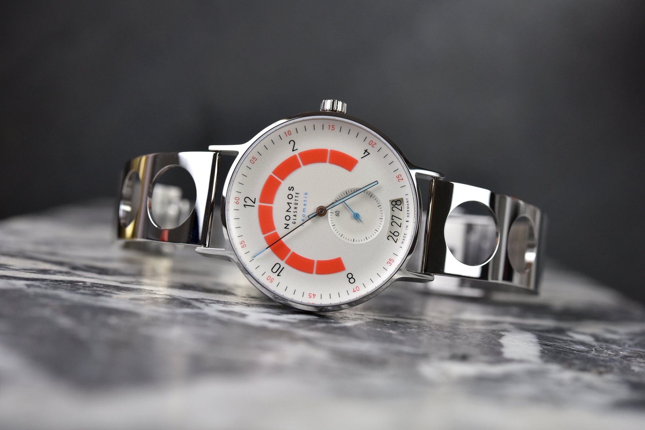 Quick Facts – 41mm x 10.5mm – stainless steel case, polished – domed sapphire crystal – sapphire crystal caseback – 100m water-resistance – bowl-shaped dial in white, black or blue – segmented painted stripe in orange, grey or yellow – concave recesses small seconds subdial – elongated date window – DUW 6101 Calibre, in-house – automatic winding – 21,600vbh – 42h power reserve – NOMOS Swing-System with blue hairspring – quick-set date system (two ways) – steel bracelet with large, perforated first link – EUR 3,800