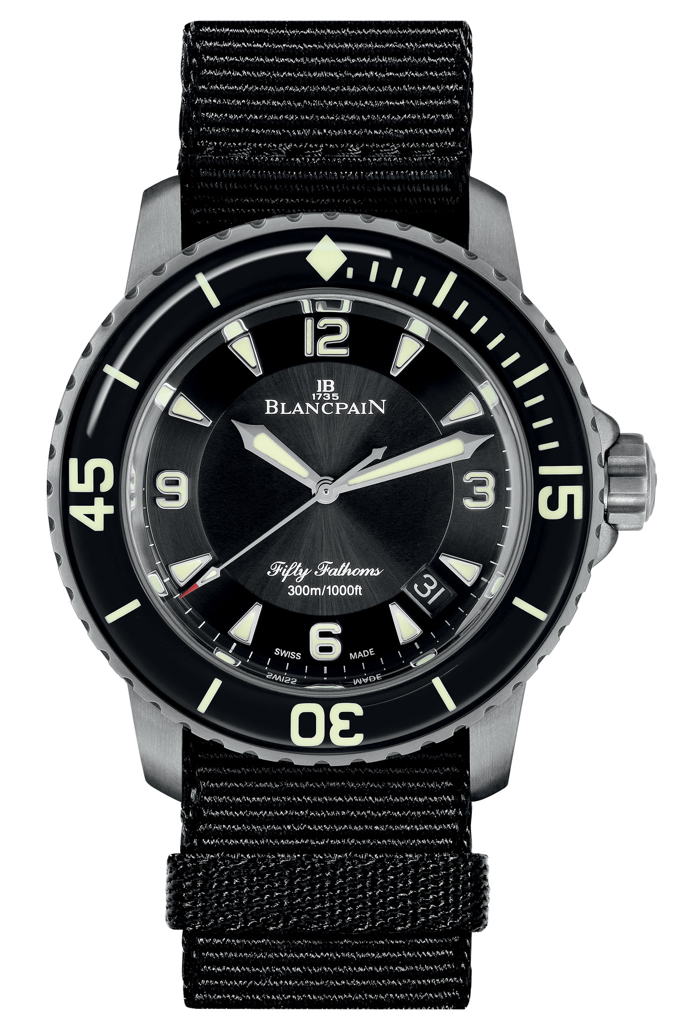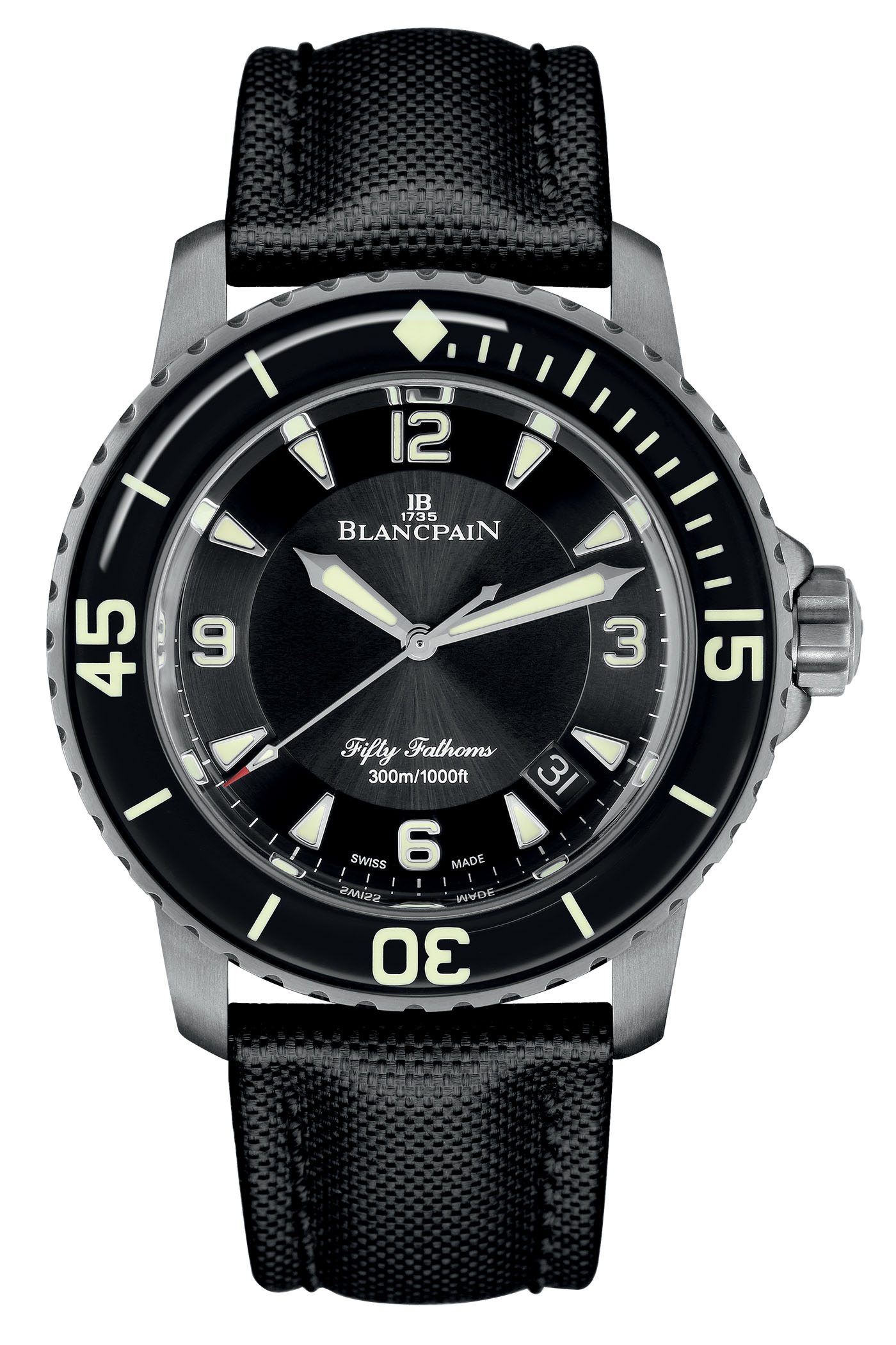 The Blancpain Fifty Fathoms Automatique 5015 Titanium is worn on a black NATO strap or on a black sailcloth strap with pin buckle. Price is set at CHF 14,700. For more information, please visit www.blancpain.com.