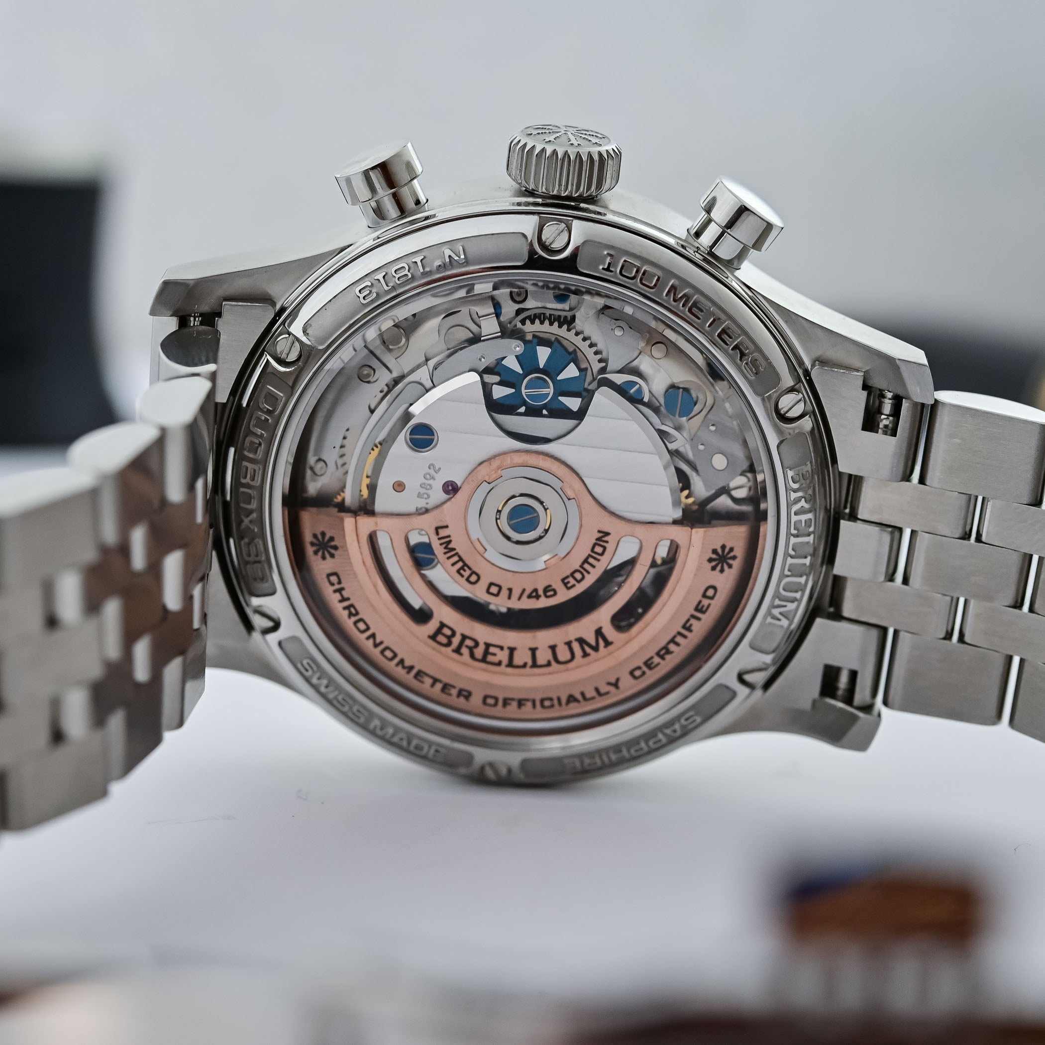The watch is powered by the Brellum BR-110 movement, based on the La Joux-Perret L110. This automatic, column-wheel chronograph is COSC-certified, runs at 28,800 vibrations/hour, and delivers a 60-hour power reserve. Visible through the rear box sapphire, the movement is finished with Geneva stripes, perlage, has blued screws and a column wheel, and a 4N gold-coated, openworked rotor engraved with Brellum’s logo.