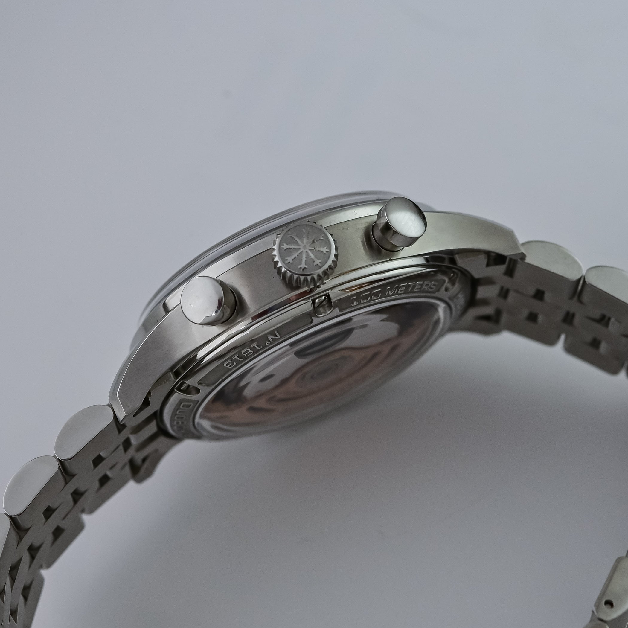 The Ice Blue mother-of-pearl dial is obviously the news. Naturally iridescent and shifting in tone, it brings a calm, luminous character that works beautifully with the Duobox’s “technical” layout. The classic tricompax configuration offers a 30-minute counter at 3 o’clock, a 12-hour chronograph totaliser with integrated date at 6, and small seconds at 9. A pulsometer scale runs around the periphery, and diamond-cut applied indices and hands are filled with Super-LumiNova.