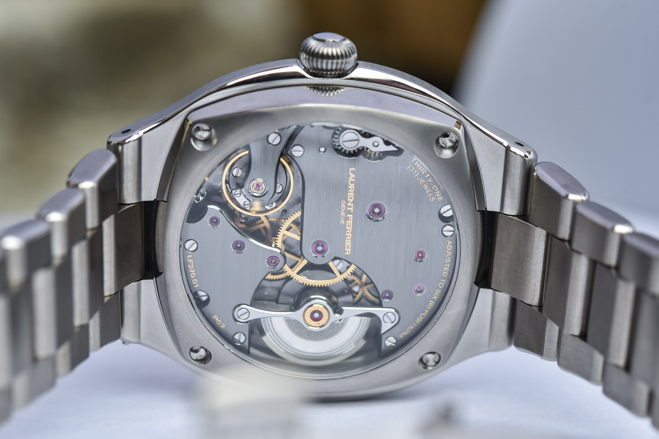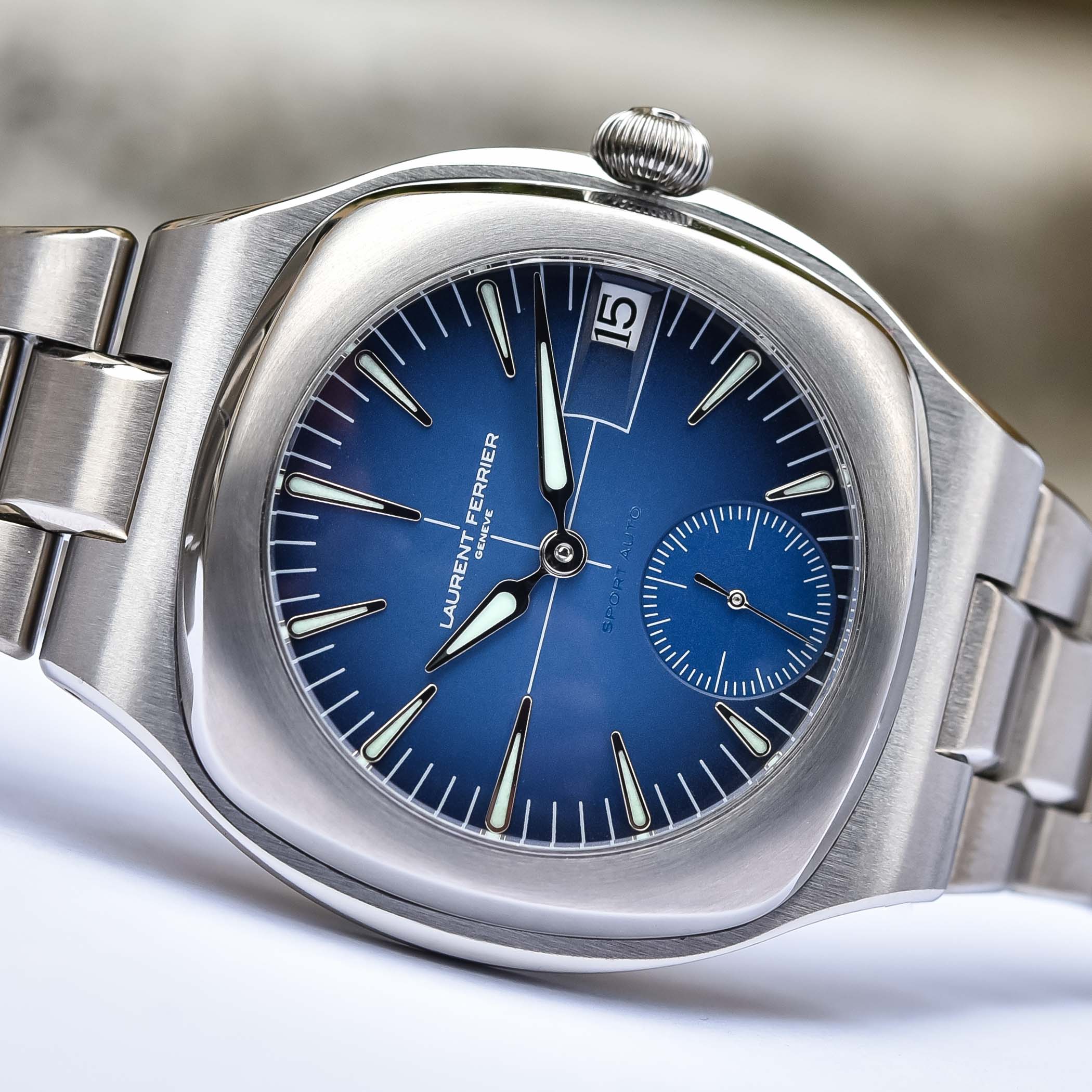 The last watch that made the list is the Laurent Ferrier Sport Auto. It’s not often a small-scale independent watchmaker releases a sports watch with an integrated bracelet, but this is a very cool one indeed! Made in grade 5 titanium, it’s surprisingly light on the wrist and is finished with the attention to detail typical of Laurent Ferrier. The opaline blue dial has applied markers and hands, and although there’s some debate over the style of the date window, we think it looks cool. Around the back, you’re treated to the exquisitely finished movement with a platinum micro-rotor. The miniature positive relief lettering on the rotor pays tribute to Laurent Ferrier’s background in motorsports. It retails for CHF 46,000 before taxes and is part of the permanent collection.