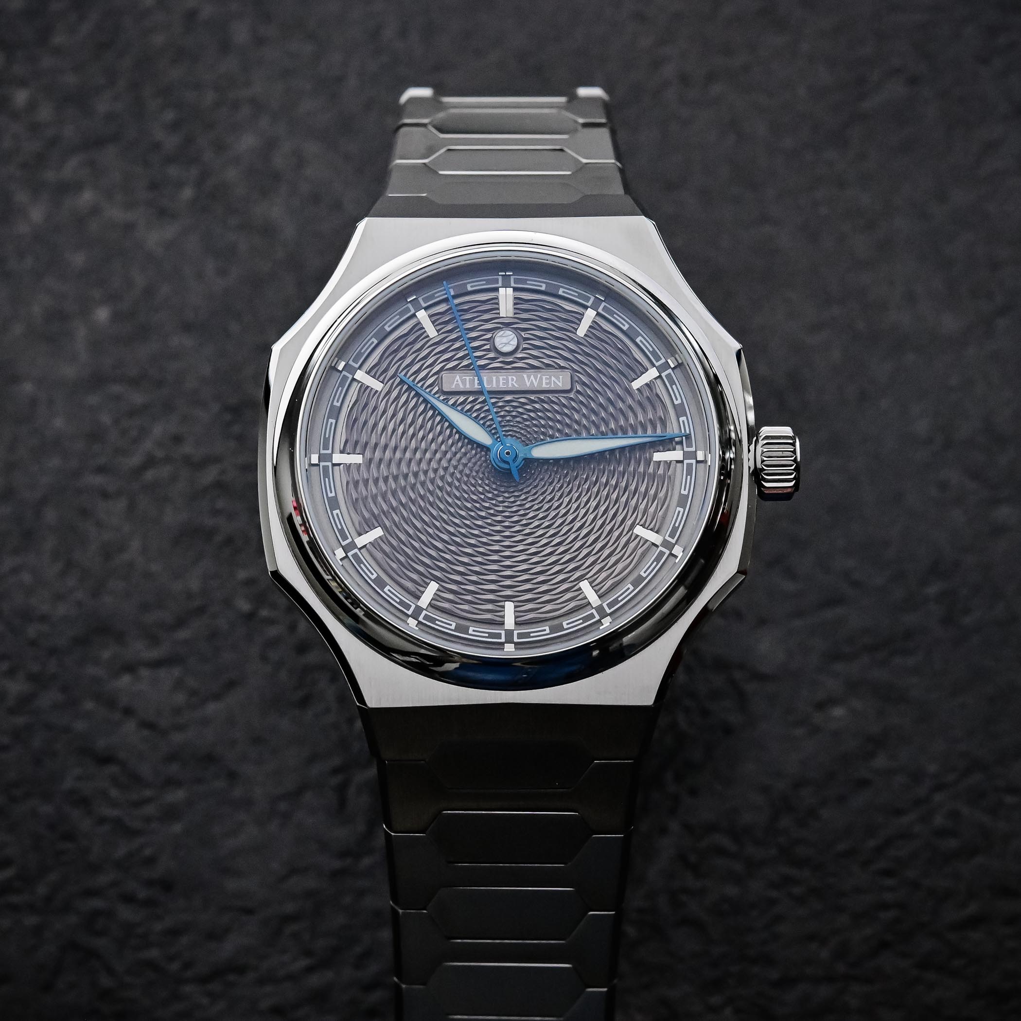 Quick Facts – 40mm 904L stainless steel case – sapphire crystal – caseback with traditional Chinese motif and sapphire window – grey, salmon or ice blue handmade guilloché dial by Master Cheng – Super-LumiNova hands and printed huiwen pattern on minute ring – customised Dandong Peacock movement, automatic – integrated 904L steel bracelet with interchangeability system – secondary rubber strap – limited in production to ~500 pieces per year – USD 2,588