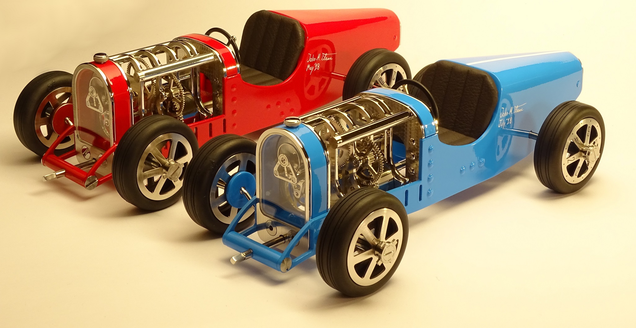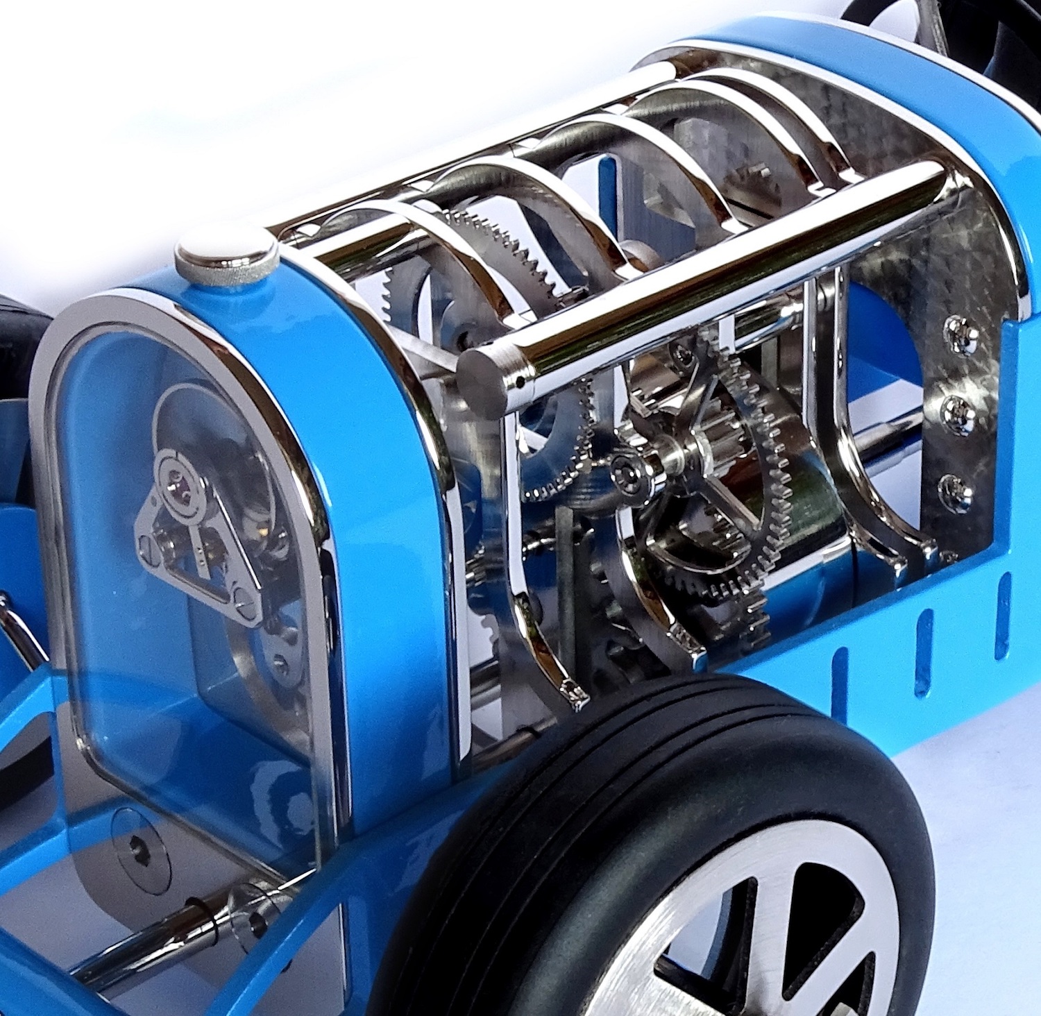 Each clock is made to order and made by hand. The movements and dashboards are crafted in the same tradition of the finest clocks with finely cut gears and delicately finished in an engine-turned pattern. The body panels of the car are formed out of aluminium and once again finished by hand in blue or red lacquer.