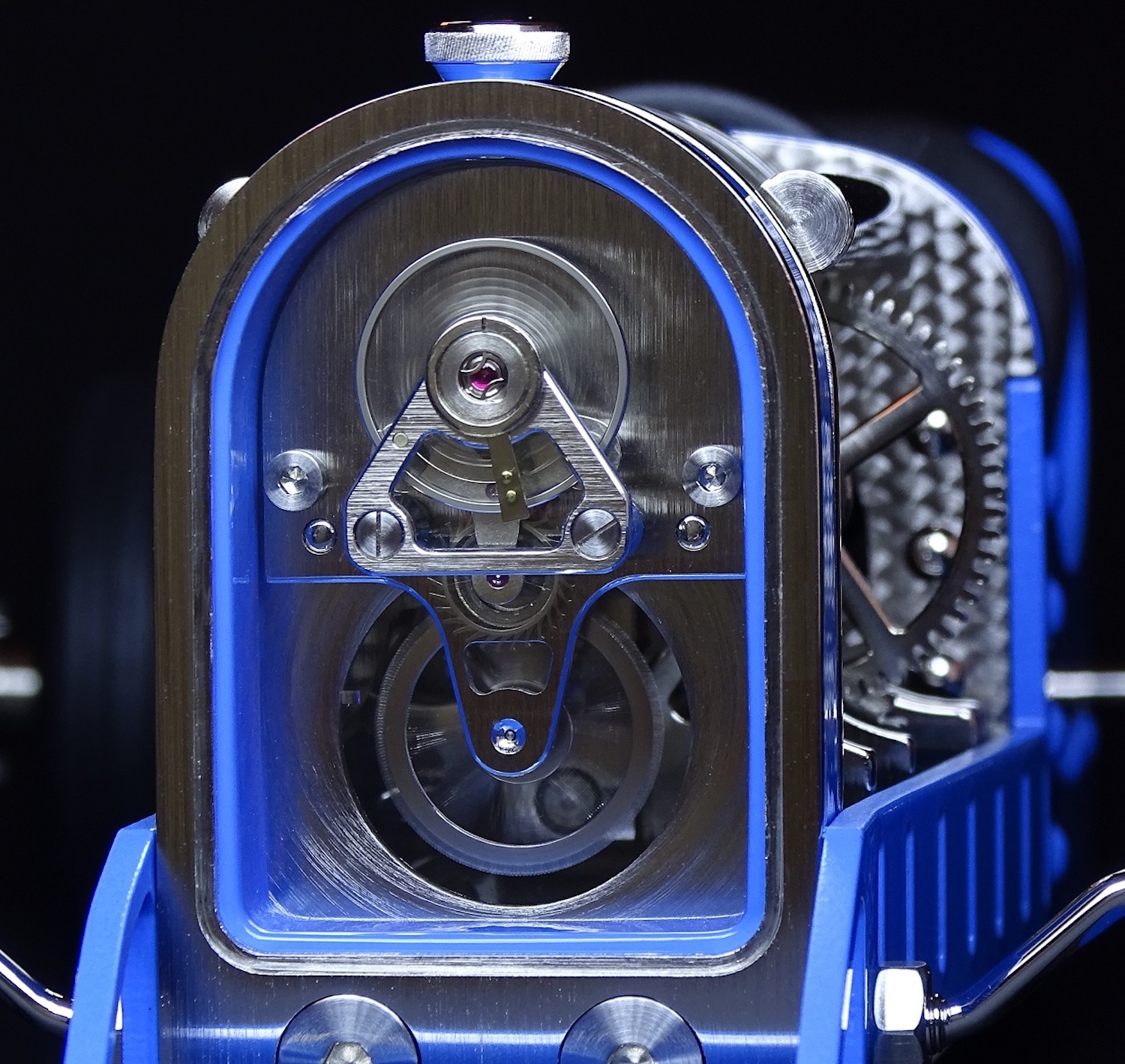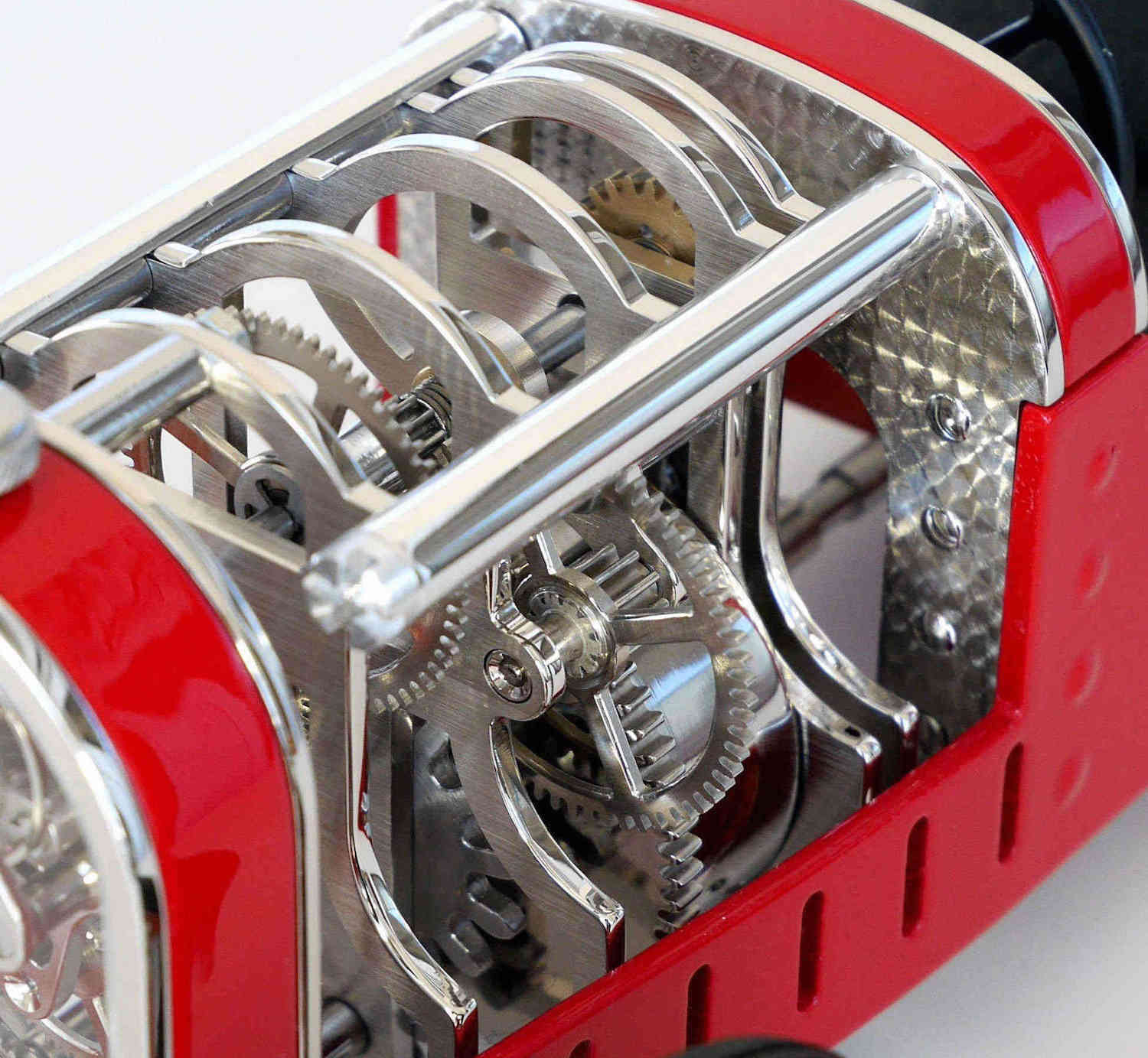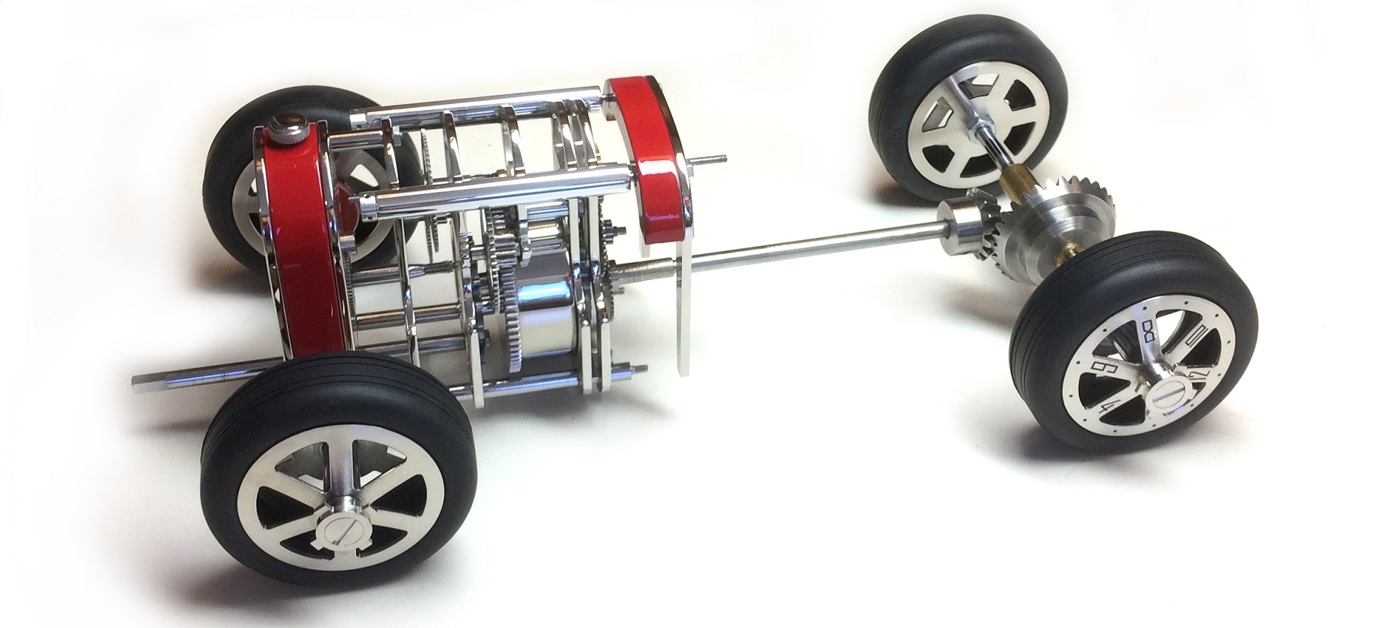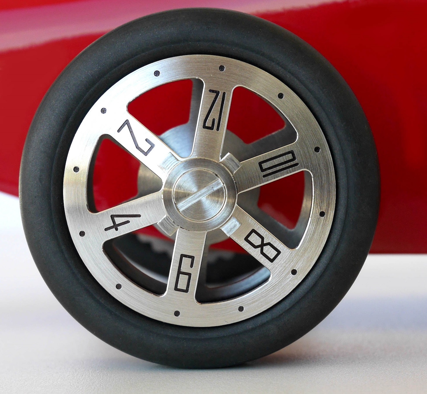 Wind the Car Clock by way of the key where the hand-crank would go on a vintage automobile and watch as it “rolls” the time away on a read-out on the hub of the rubber clad rear wheels. The balance wheel roars to life where you’d typically expect to find a cooling fan in a real engine. The mainspring and other gears mime the camshafts and crankshaft of an internal combustion engine. Power is sent to the rear-wheels via differential which takes its motion from the driveshaft running through the centre of the car.