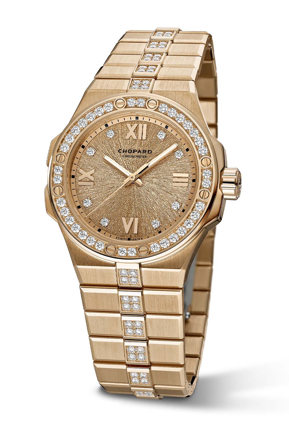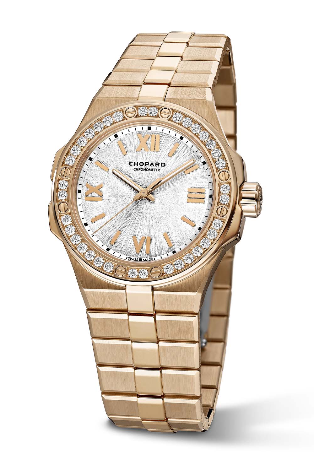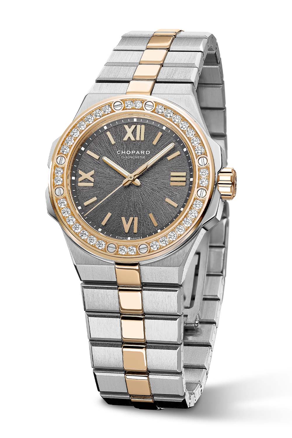Fast on the heels of the Alpine Eagle Pine Green model, Chopard is also releasing six references in a new 33mm case size. When the Alpine Eagle luxury sports watch collection was introduced in 2019, the first time-and-date models were offered in 41mm and 36mm case sizes, moving up to 44mm cases for the chronograph models The new, smaller case size is evidently targeting women and comes in ethical rose gold or Lucent Steel – and combinations of both materials- with or without diamonds on the bezel. Like all members of the Alpine Eagle family, the watch and the chronometer-certified movement are developed and manufactured in-house. And perhaps the best news of all, the date window featured on larger 41mm non-jewellery models has been suppressed.