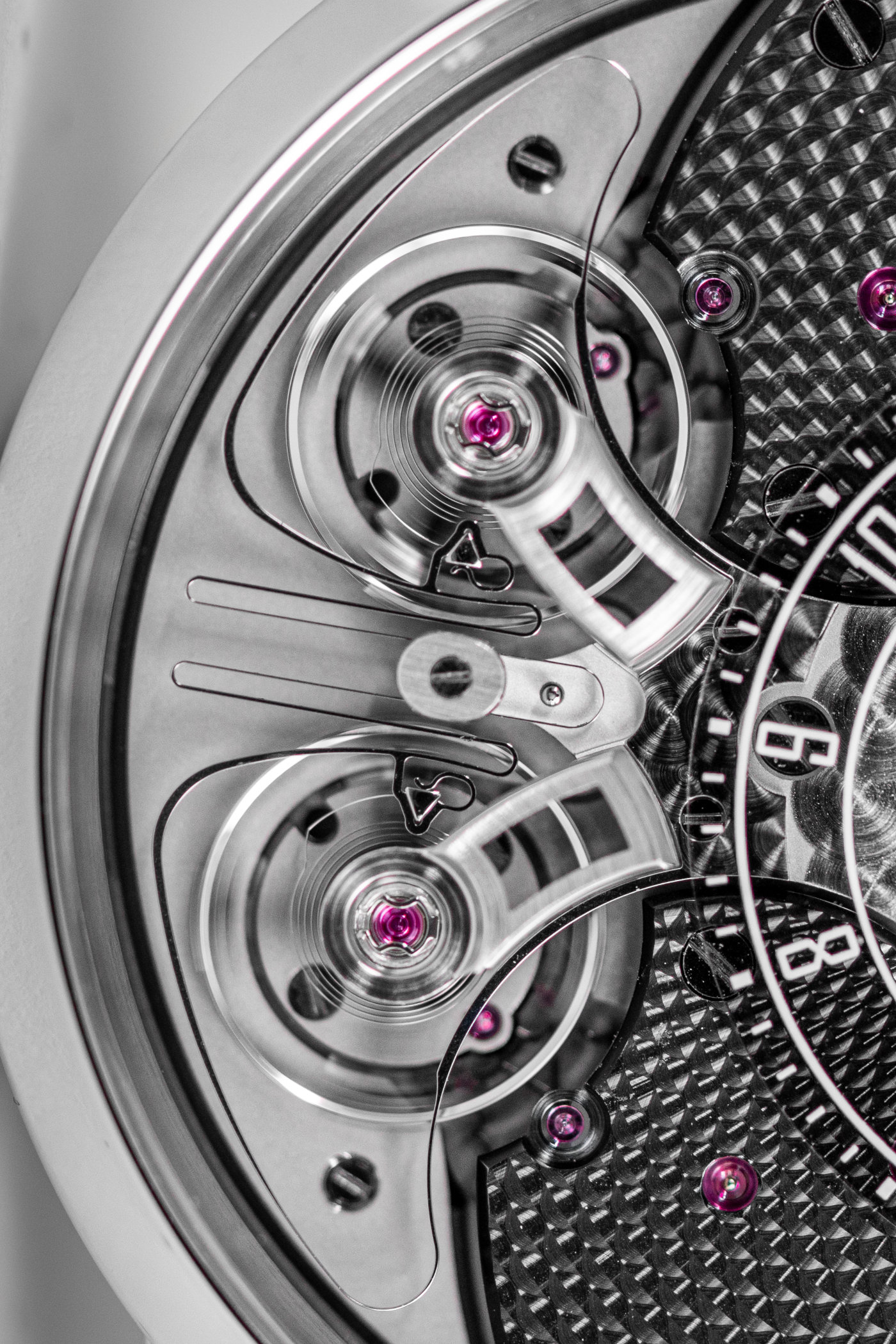 Oh yes! The backside has been opened up to show the crown wheel’s improved ratchet mechanism – which gives the click-click sound when you wind the watch. The back side also carries “the pin”, Armin Strom’s seal of origin. This is the part that has been engraved with “Horomariobro”, the Armin Strom symbol and a unique serial number in the limited edition, before being matt finished, hand-bevelled and circular-grained. Very beautifully done.