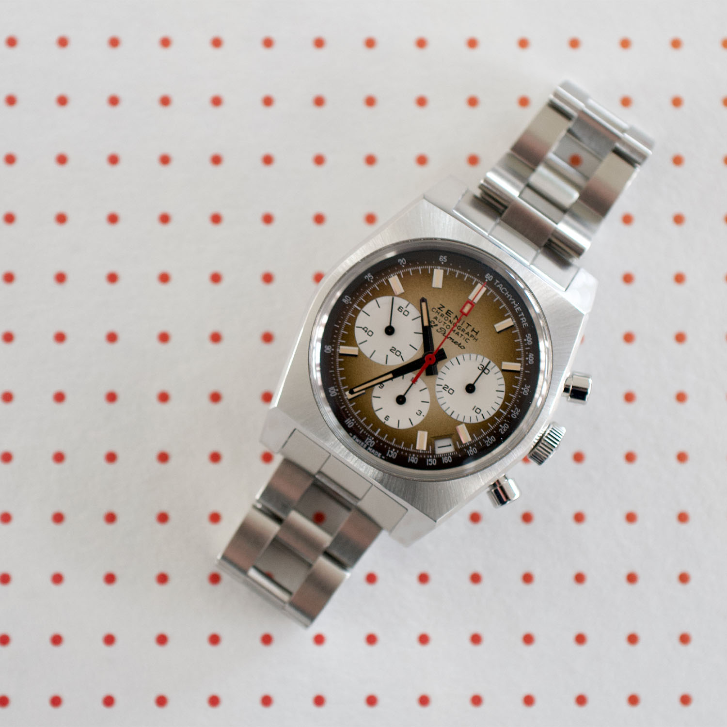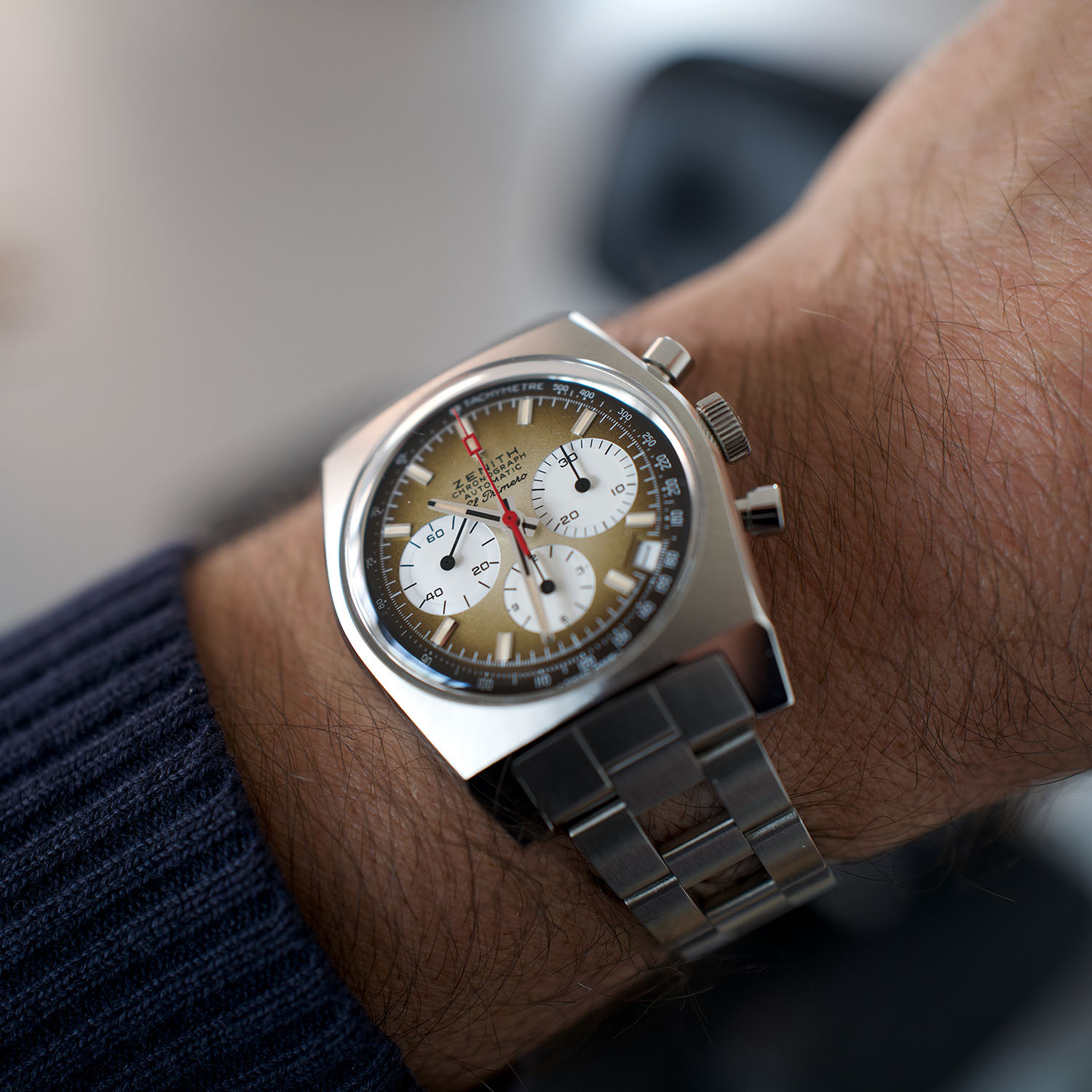 But, the fumé brown dial, in combination with the original case shape and measurements, equipped with the El Primero, the most famous automatic chronograph movement of all times, did it for me. Also, the steel ladder bracelet, a direct reference to the famous Gay Frères bracelet manufacturer from the past, gives this watch a rather unique appearance. I ordered the original leather strap as well since I like the matching colour of it a lot.