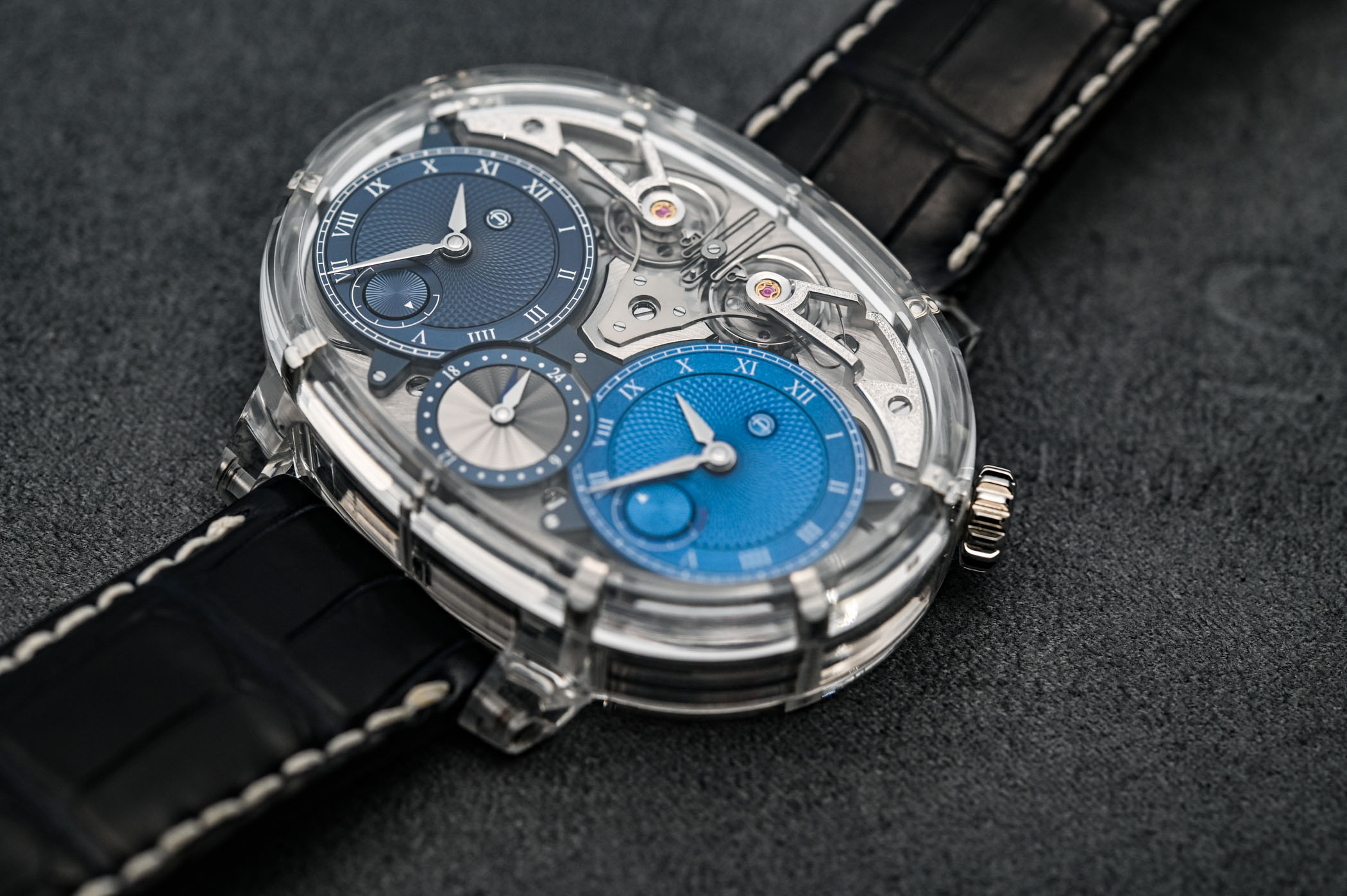 The clever answer would be that putting an open-worked movement into a sapphire case made this iteration more consistent with the brand’s ‘transparent mechanics’ ethos. The more serious answer is that it was the best option to highlight this extraordinary movement’s meticulous hand-finishing – and to see it from every angle. The sapphire case also invites more light into the movement – and that’s always a plus – particularly for people like me who enjoy repeated viewings with a loupe. A related benefit is that you get more ‘pop’ from the contrast between the movement’s high-polish and satin surfaces, not to mention the tremblage finishing on the balance bridges and the blue guilloché dials. All of those elements love the light. The sapphire case also completely changes its aesthetic presentation – making it more consistent with the ‘art piece’ vibe of the watch. More abstractly, I think that the artisanal effort of having to cut, hand-finish and hand-polish a complex sapphire case actually makes it more consistent with the values of haute-horology watchmaking, particularly when the movement on display is finished to such a high standard.