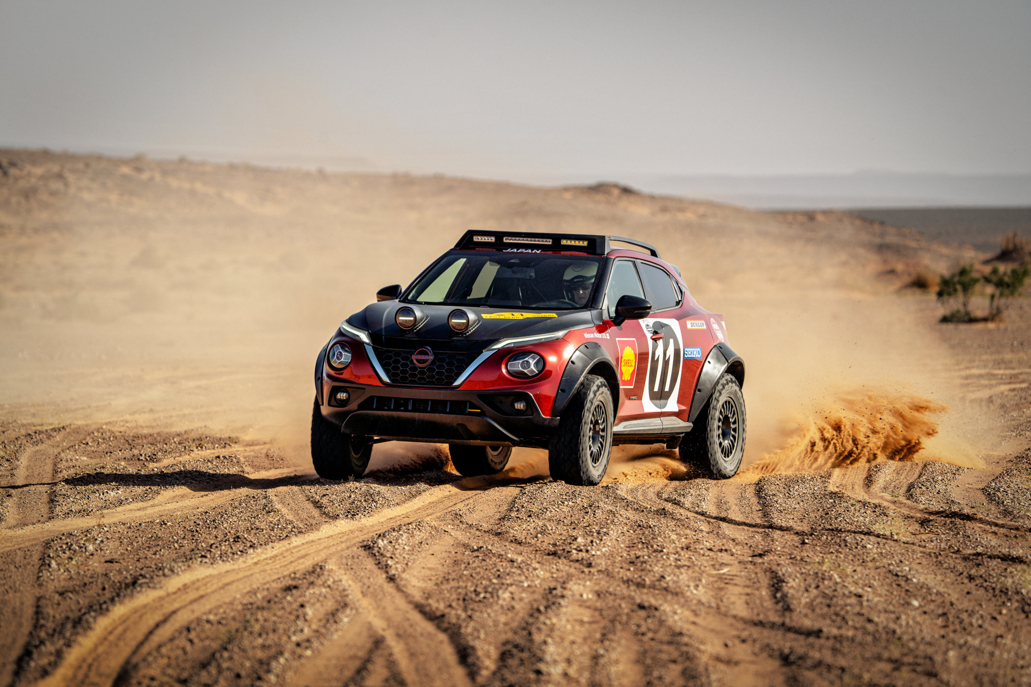 So how does one capture the spirit of a 1970s rallying coupe in a present-day compact SUV? You start with the exterior of course, which is finished in the same red and black as the Datsun 240Z that won the rally in 1971. Next to that has received upgrades such as rally lights, straight exhaust pipes, spare offroad tires and a roof rack (sort of). It also comes with the same sponsoring and decals as its predecessor, so a true homage to the 1971 original despite being a completely different car.