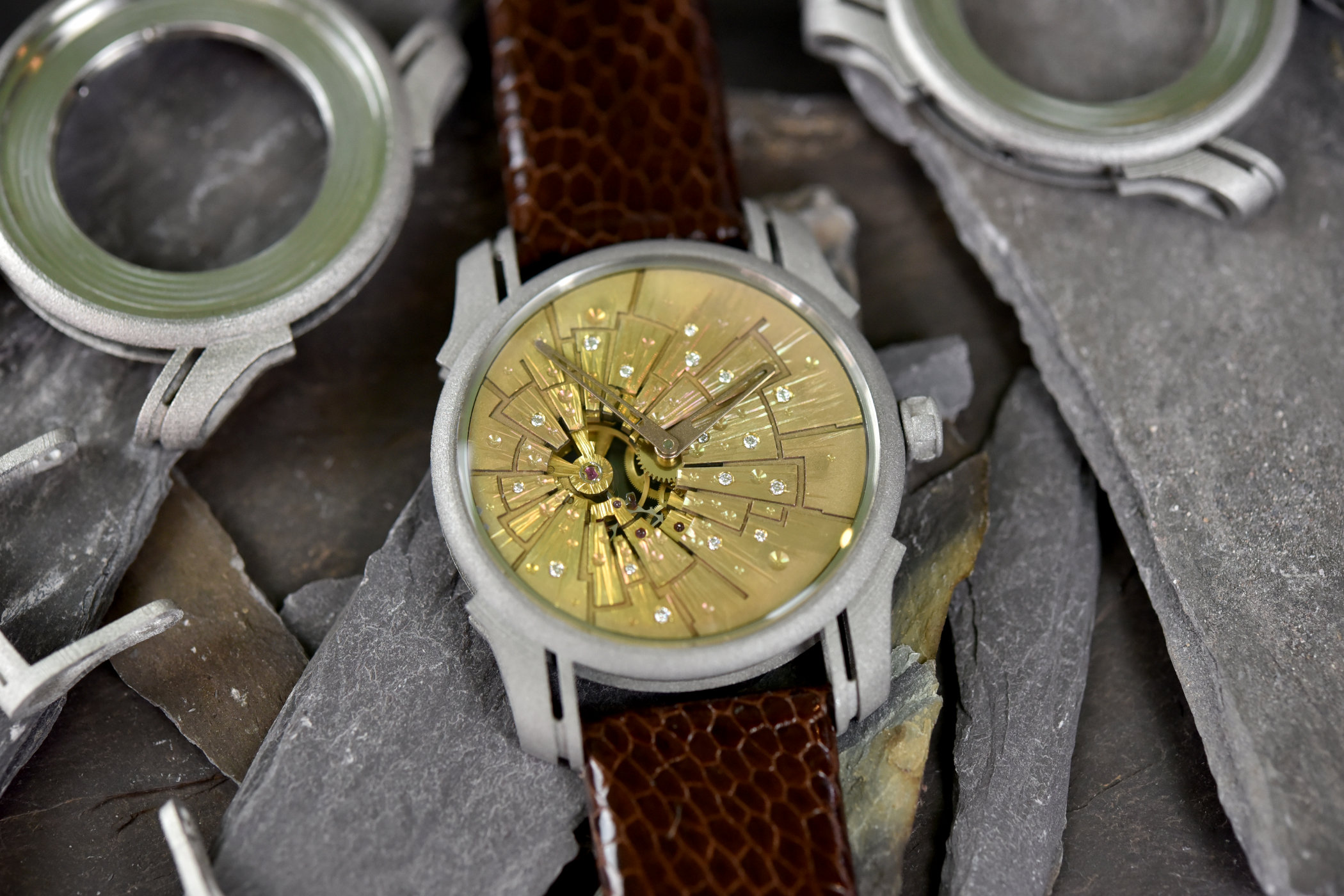 The Holthinrichs Liminality is housed in the same ornamental 3D printed steel case as most other watches from the Dutch atelier. (There’s 3D printed bronze, gold or platinum available as well). However, as this is the second piece marks the transitional stages of Liminality, it now comes in a completely RAW look. The idea is that you get a sense of the progress of the catastrophic impact that kick-started the series. It still measures 38mm across and a slim 9.9mm in height including the plexiglass crystal. The hollow sculpted lugs give it a sense of air and remove a touch of weight as well.