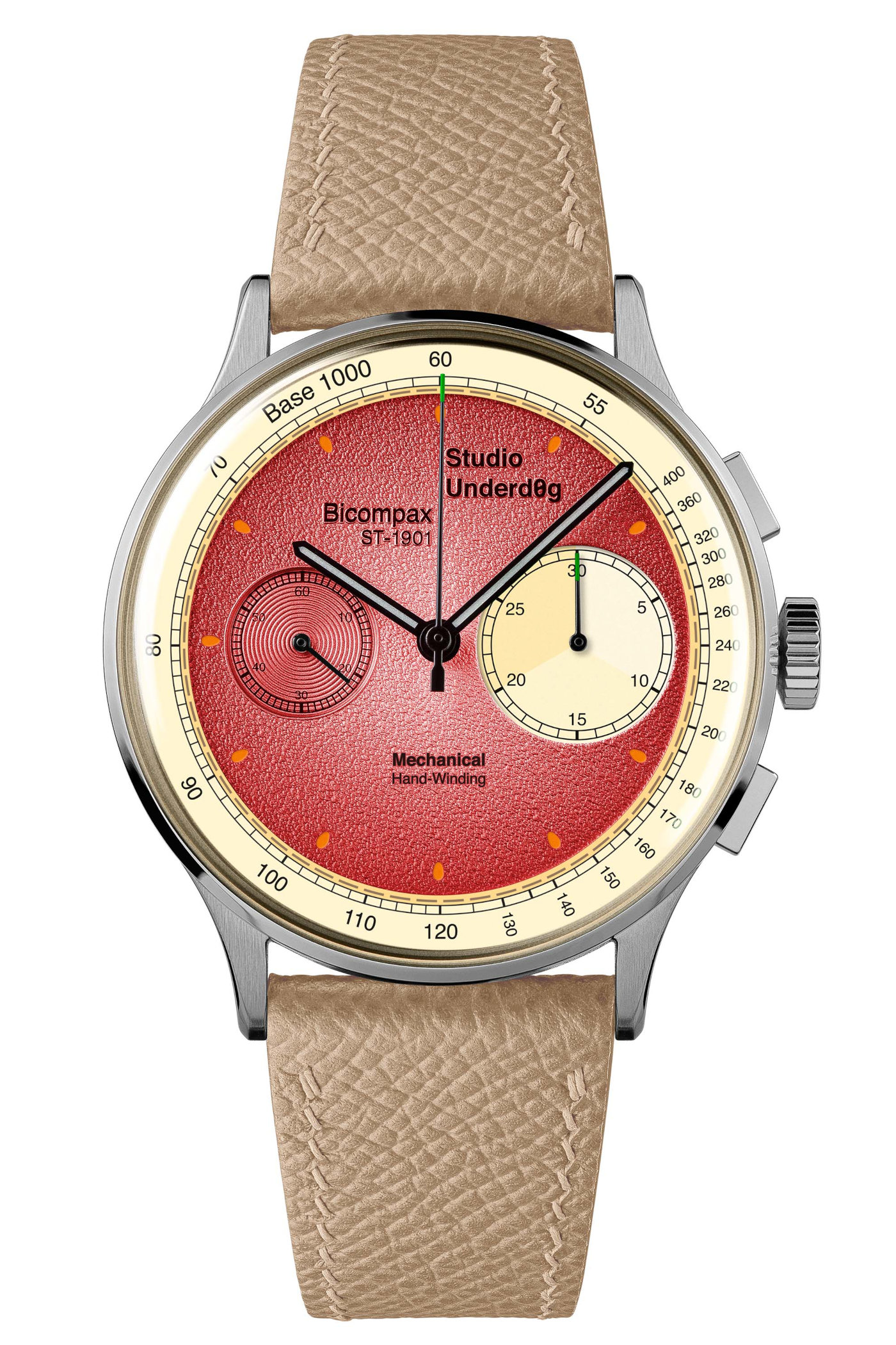 Like the Fratello Aubergine watch, the Strawberries & Cream is based on Studio Underd0g’s vintage-inspired bi-compax chronograph, enlivened with a refreshingly modern dial. As a trained designer, Benc has invested a lot in aesthetics, which by no means translates into empty horological content; quite the opposite.