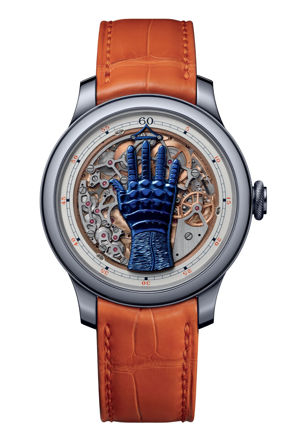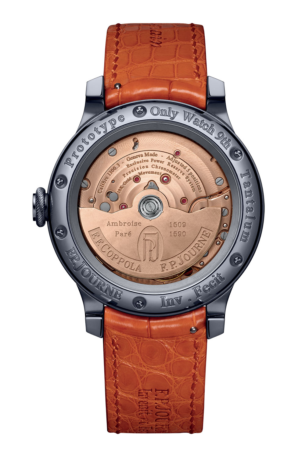 The idea of the watch was born during a dinner that François-Paul Journe had with Francis Ford Coppola in 2012. As Journe explains: “He asked me if it could be possible to tell time with a hand in a watch. I replied that the idea was interesting and required thinking about it. But how to display 12 hours with five fingers? It was not an easy matter, and this complex challenge inspired and motivated me. Once I figured it out, Francis immediately sent the sketches for the finger positions. After more than two years, I could finally focus on “Fecit”. After seven years of development, I am proud to present the FFC prototype.” The fingers are inspired by a mechanical hand created by Ambroise Paré (1509-1590), the father of modern surgery.