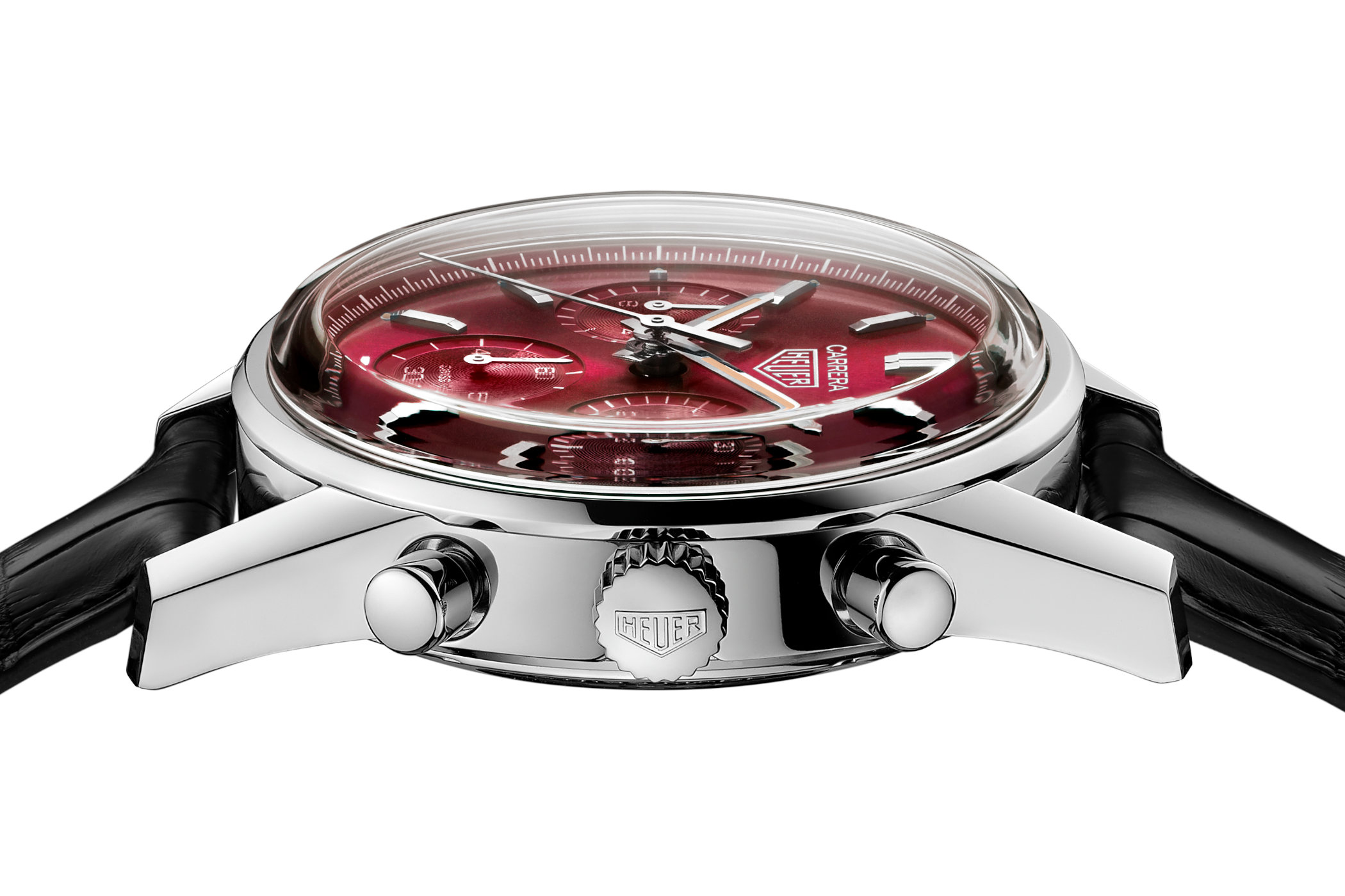 Where TAG Heuer went for an on-trend and very beautiful teal-green dial last year, this new limited edition goes down the crimson-red path. The fiery red sunray-brushed dial pops against the polished steel case. This generation of Carrera Chronograph captures the design of the earlier models and presents it in a surprisingly classic yet fresh-looking dial. Details like the polished and rhodium-plated hands and applied indices give the Carrera Chronograph a bit of sparkle, while the beige-coloured Super-LumiNova elements give off a more vintage feeling. The small seconds are indicated at 9 o’clock, with the chronograph 30-minute and 12-hour counters positioned at 3 and 6 o’clock respectively.