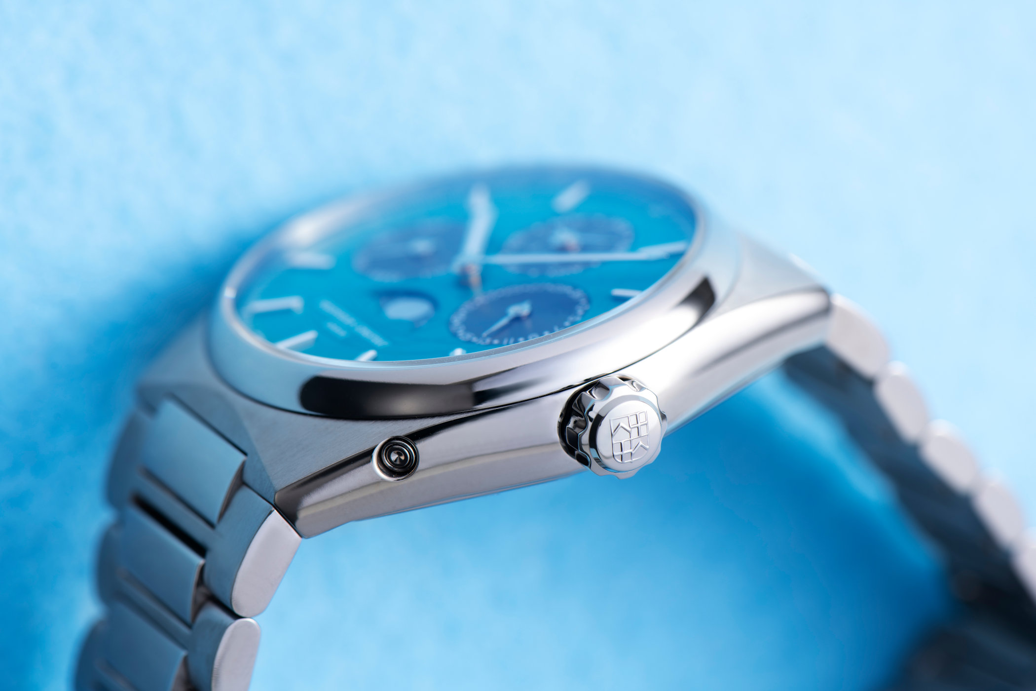 It still measures 41mm in diameter and follows the familiar shapes and finishings of the rest of the Highlife collection. The dial is done in a Pantone 321 turquoise blue, taken from run-off areas of the Yas Marina Formula 1 circuit in Abu Dhabi and resembling the unique shade of blue of the Gulf waters. For a touch of contrast, the sub-dials for the perpetual calendar display are dark grey. As always, a globe decoration adorns the middle section of the dial.