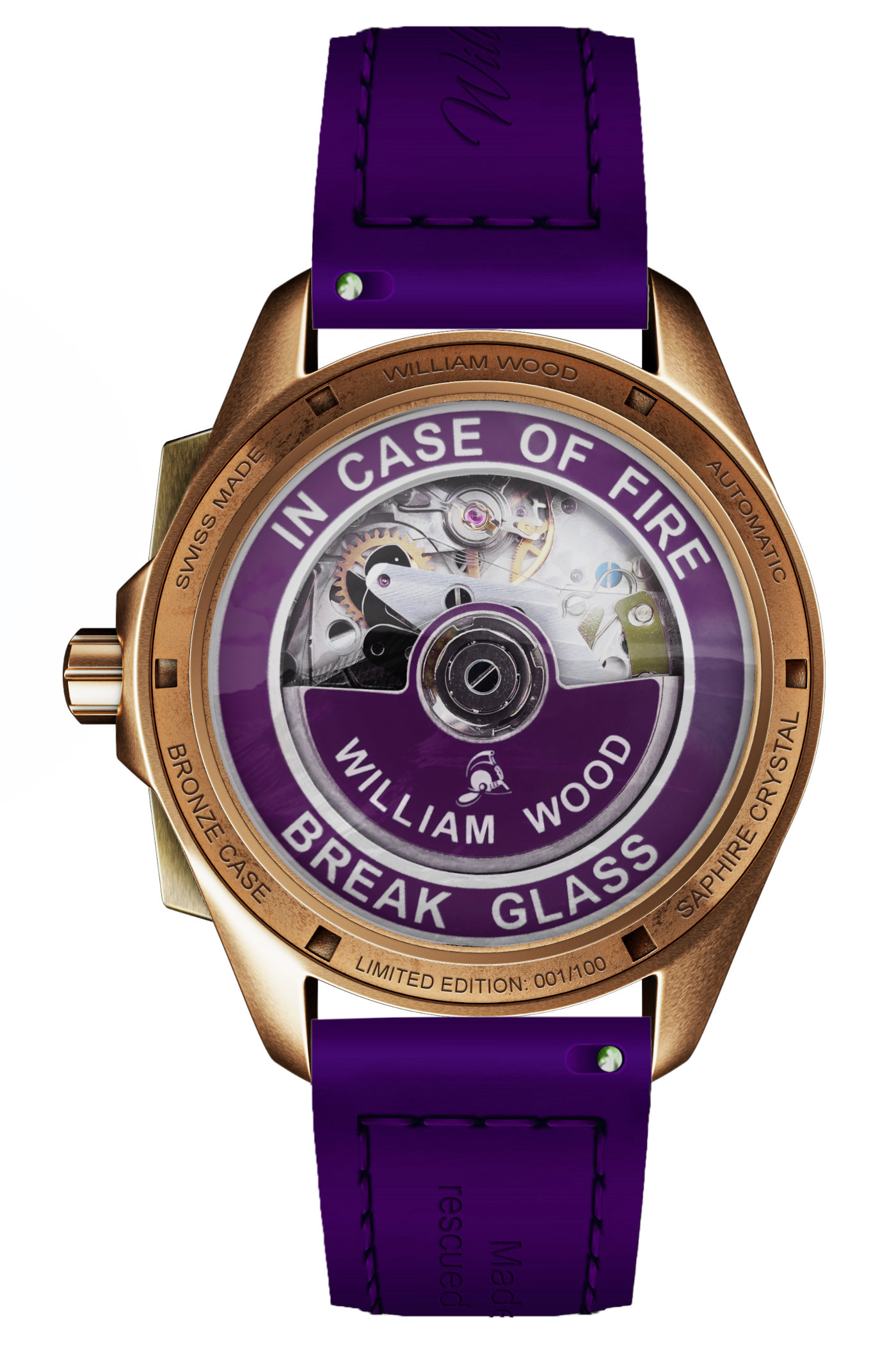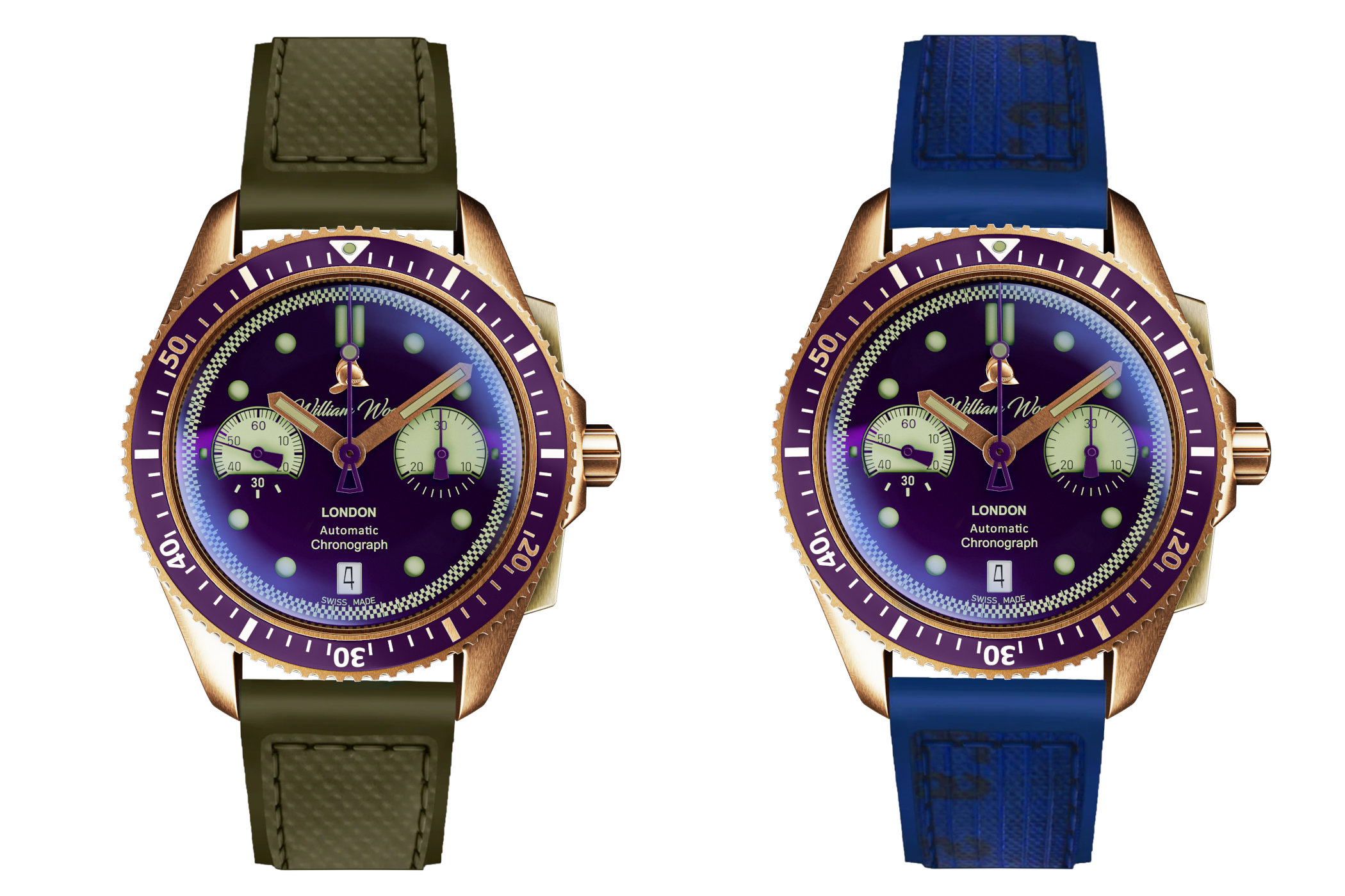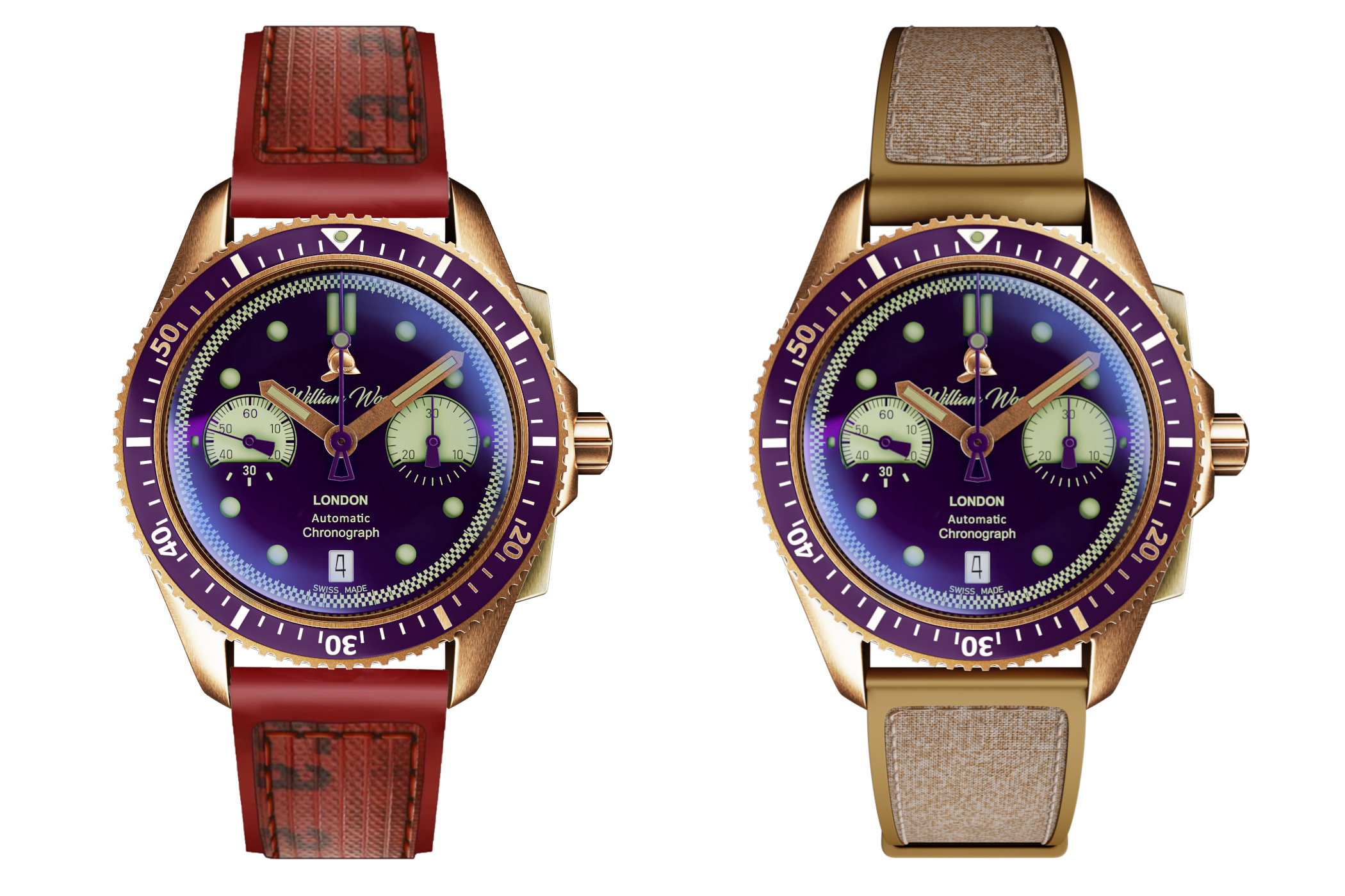 Just like all William Wood Watches, the Triumph Chronograph Jubilee is worn on an upcycled firehose strap. The material is sourced from actual firehoses used by fire brigades, all with a minimum of ten years of service. For this special edition, William Wood Watches has managed to find purple firehoses. The insert is set on a rubber base to keep it supple and is closed with a pin buckle. Other colours and styles are available, as shown in the image. The first batch is limited to 100 pieces and retails for GBP 2,795, excluding taxes.
