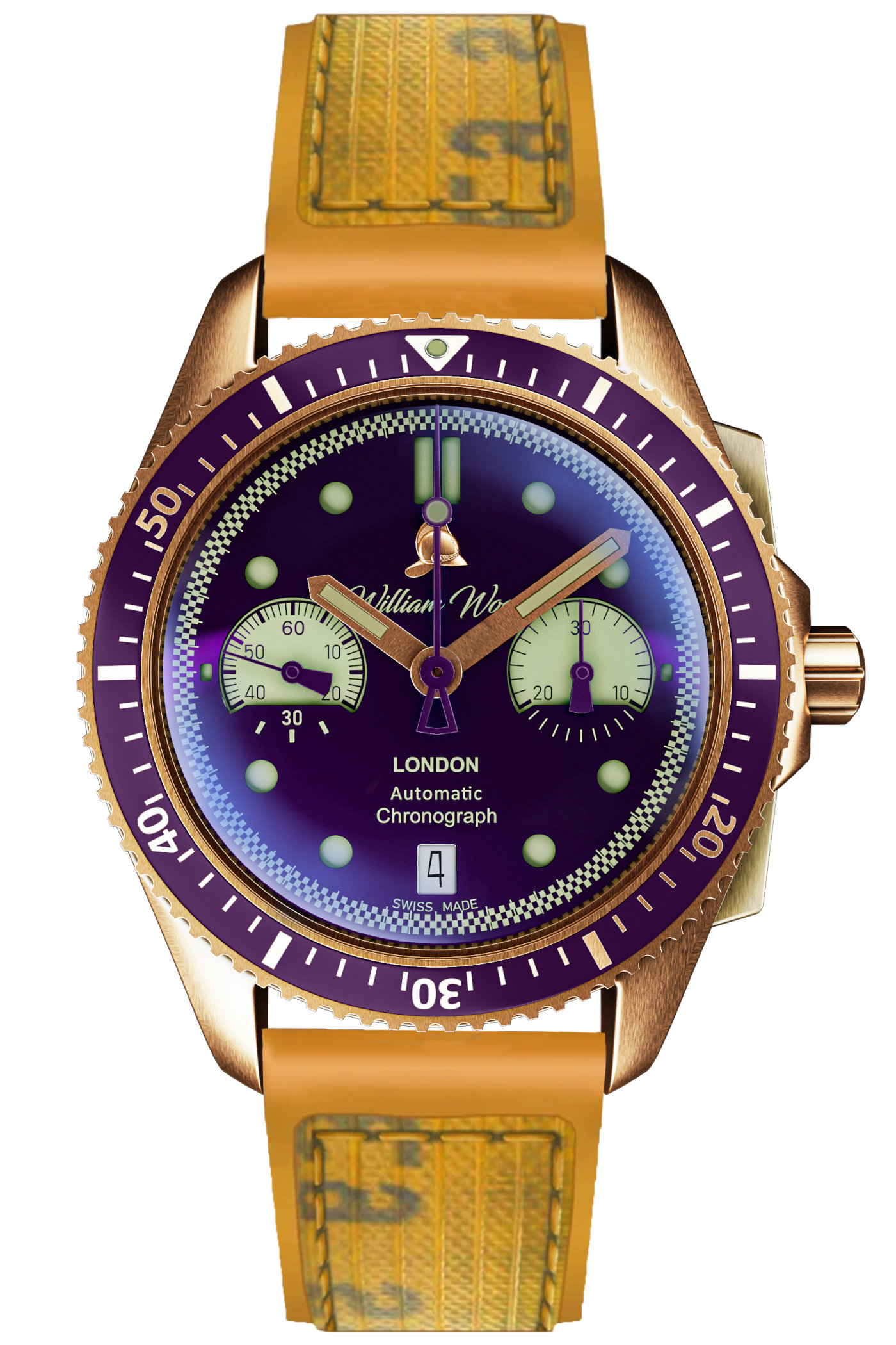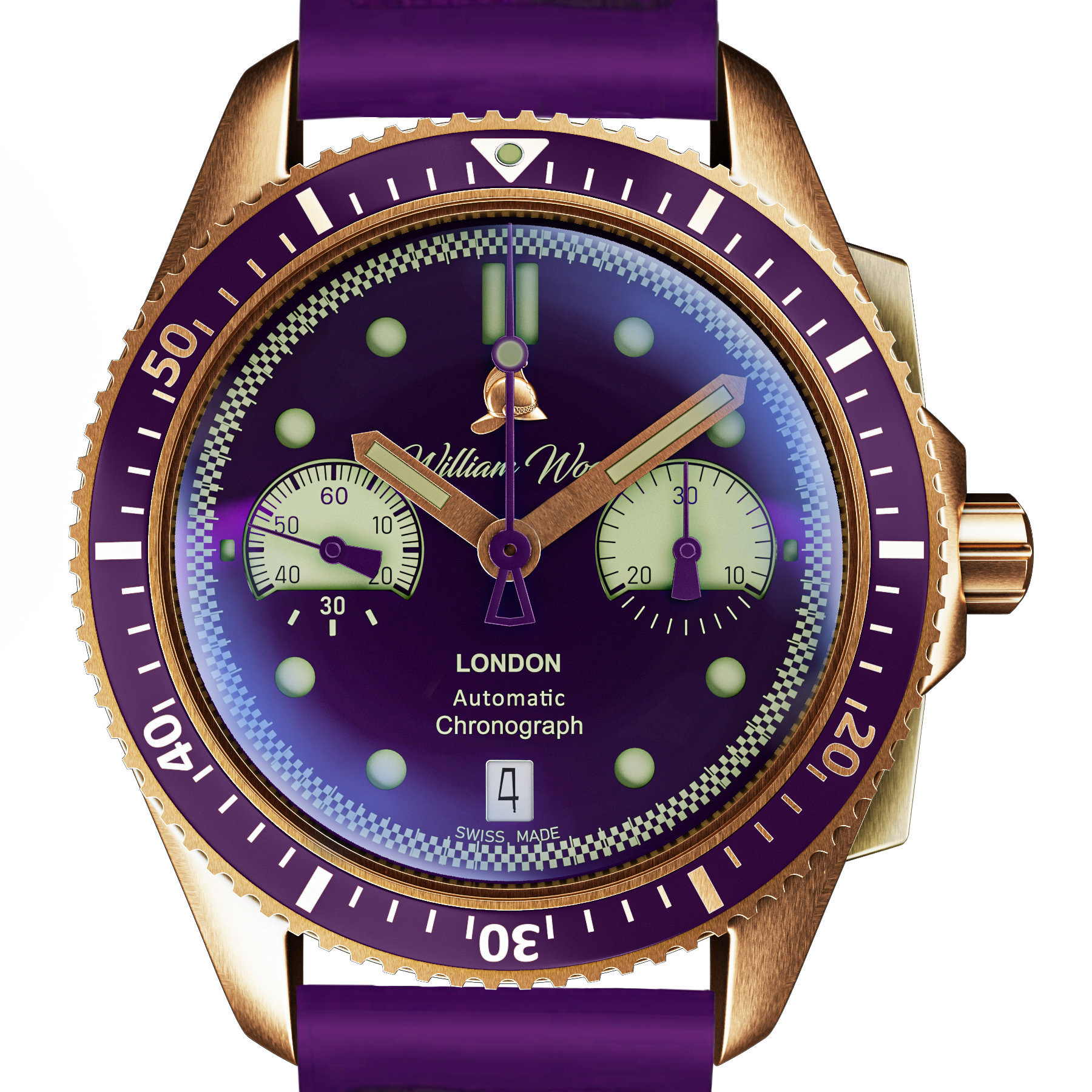 Queen Elizabeth has just celebrated her 96th birthday, which coincides with the 70th anniversary of her reign. A monumental moment, as she is the longest-reigning British monarch. To mark this special occasion, William Wood Watches introduces a Jubilee edition of its Triumph Chronograph. The brand that’s all about firefighting has opted for a striking combination of a bronze case and a purple colour scheme. This is the William Wood Watches Triumph Chronograph Bronze Jubilee, a combination of case material and colours first used in the Bronze Amethyst Five-Year Anniversary Edition.
