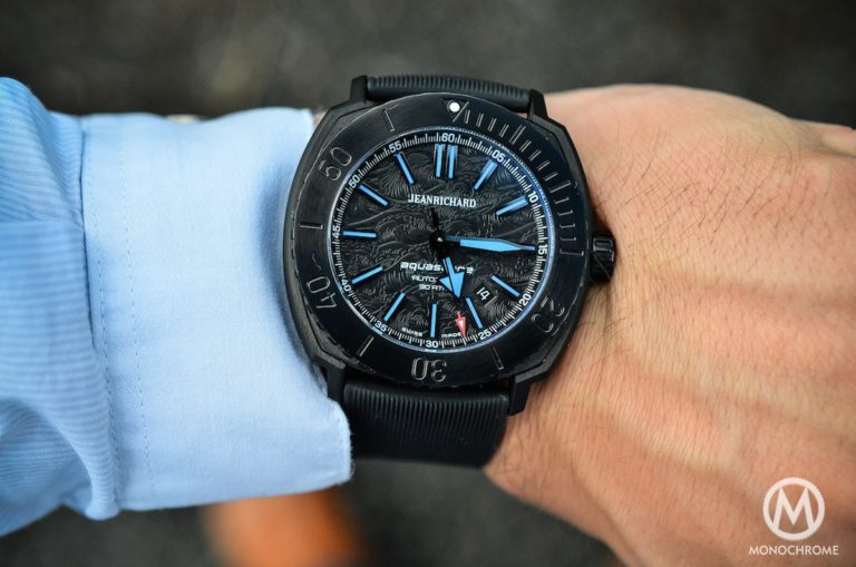 The bold look of the case back’s engraved JEANRICHARD logo fits with the watch’s scale and contrasts against a matt background. The eight indentions for case back removal create a symmetry around the circumference and add to the watch’s tough demeanor. Despite all that is happening on the back, the Terrascope still sits smooth against the wrist. With only 100 meters water resistance, this watch is made for land, but can handle the sudden downpour or treacherous creek crossing, and if needed, you might use it to hammer nails.