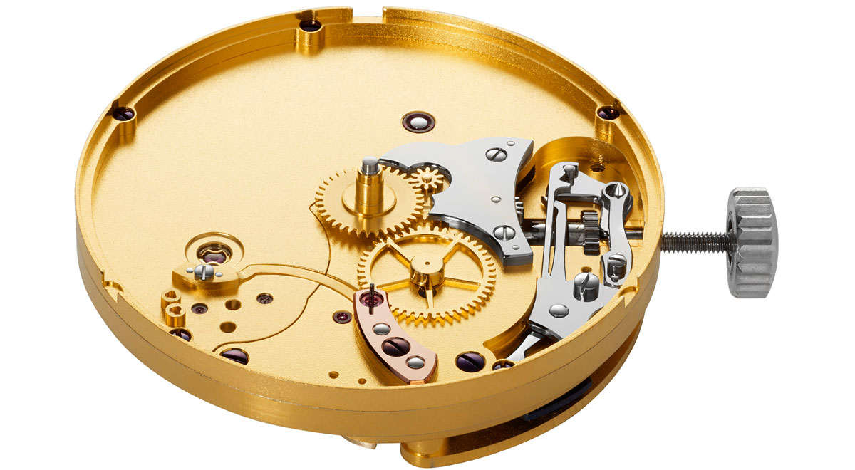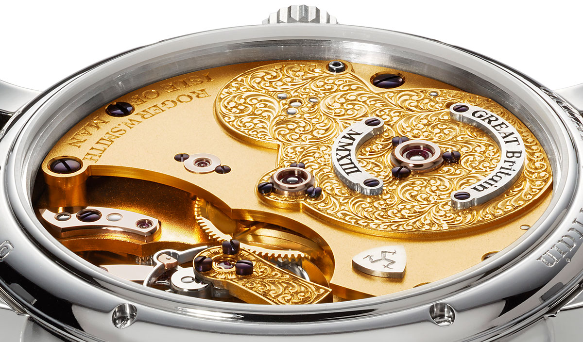 - Movement: 3/4 plate with floral hand engraved raised barrel bridge, fitted with the Isle of Man’s Triskellion symbol and two applied sterling silver cartouches engraved GREAT Britain and MMXIII, both secured with blued screws, single wheel Daniels Co-axial escapement developed by Roger Smith, free sprung balance, 23 jewels, gilded and frosted hand engraved plates, red gold chatons and cocks, screw are flame-blued to a purple and blue hue.