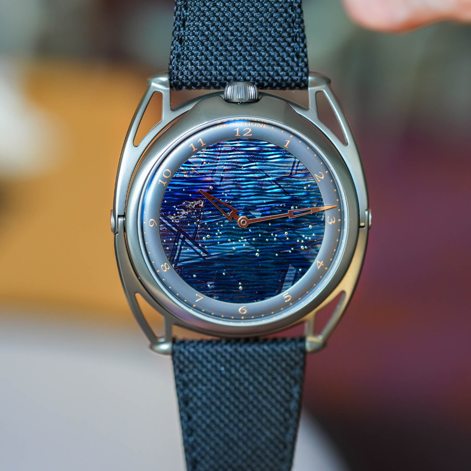 Many of De Bethune’s watches reveal master watchmaker Denis Flageollet’s passion for outer space. Who could forget his interplanetary delta-shaped spaceship known as the Dream Watch 5 or his heat-blued titanium models that evoke the mystery of our cosmos? Flageollet is also drawn to extraterrestrial materials like iron meteorites, particularly fragments of the famous Muonionalusta meteorite. However, unlike other brands with meteorite dials, Flageollet applies his alchemical thermal oxidation to achieve a heavenly blue colour like that featured on the dial of the DB28XP Meteorite in 2021. The latest adventure with meteorites is the DB28XS Aerolite with its more compact 39mm case in black zirconium and a stunning blue Muonionalusta meteorite dial.