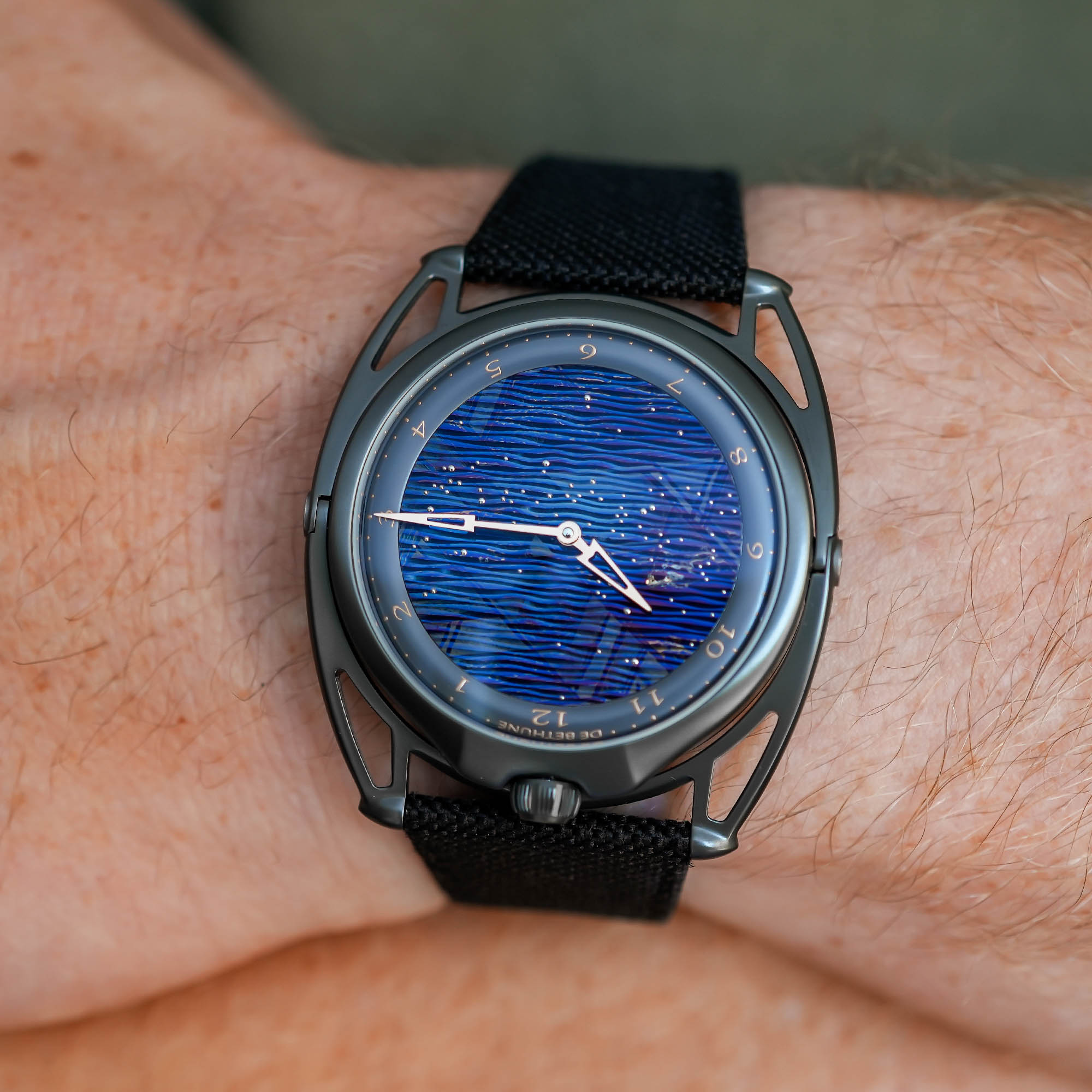 A slice of the Muonionalusta meteorite is treated to De Bethune’s thermal oxidation for a truly out-of-this-world dial.