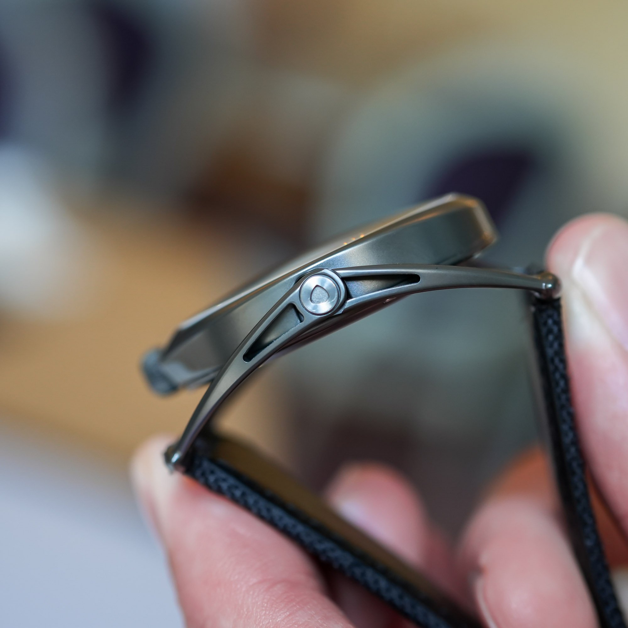 De Bethune’s DB28XS is the smallest model in the brand’s repertoire. Distilling the main elements of the iconic DB28 with its floating articulated lugs, delta-shaped bridge, crown at noon and futuristic silhouette, the DB28XS has a more compact 38.7mm diameter coupled with an ultra-slim case height of 7.4mm. Instead of titanium, the new model has a zirconium case. Although it is fractionally heavier than titanium, zirconium has a similar matte gunmetal colour.